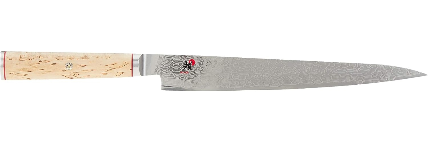 - Der MIYABI Sujihiki hat eine Klinge aus ultrahartem MC63-Pulverstahl, die mit 100 kunstvoll geschmiedeten Lagen Stahl ummantelt ist.