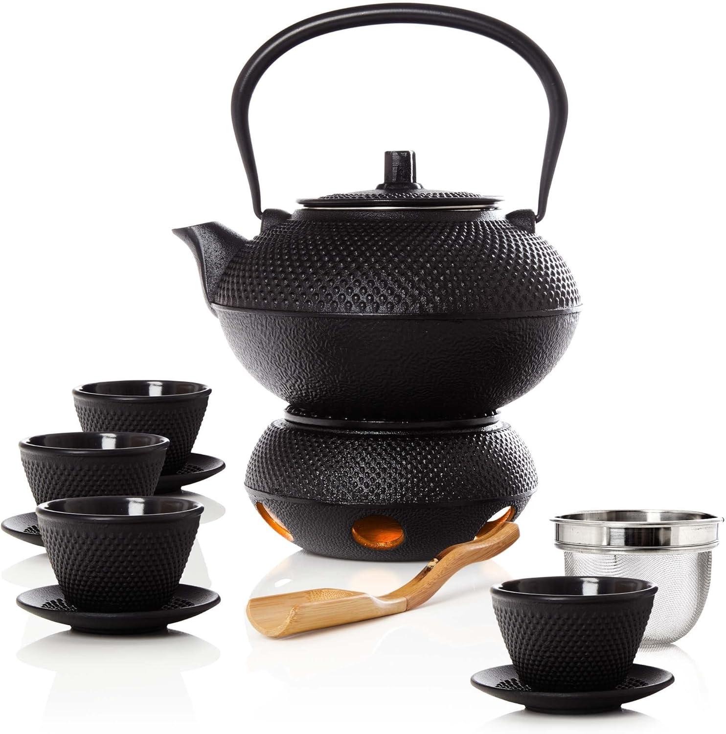 in KücheBonvivre Teeset "London" 12-teilig Gusseisen-emailliert Kanne, Teewärmer, 4 x Tassen + Untertasse, Sieb und Löffel