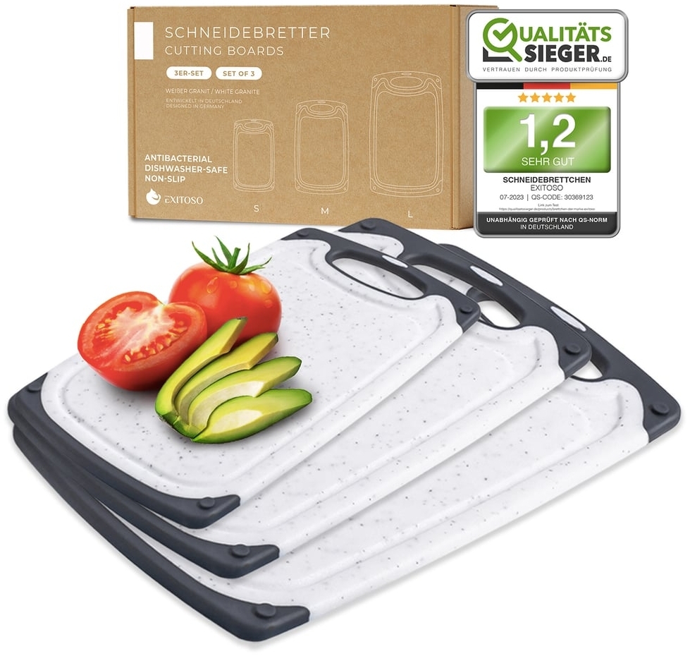 Praktisches 3er-Set EXITOSO Frühstücksbrettchen in Marmoroptik Weiß. Ideal für jede Mahlzeit, ob Frühstück, Mittagessen oder Abendbrot. Die robusten Kunststoffbretter sind rutschfest, beidseitig verwendbar und verfügen über eine integrierte Saftrille. Sie sind BPA-frei, hygienisch und spülmaschinengeeignet, was sie zur perfekten Wahl für den täglichen Gebrauch macht. Mit praktischem Griff für einfache Handhabung und platzsparendes Aufhängen. **Highlights** - Rutschfestes Design für sicheren Halt auf der Arbeitsfläche - Integrierte Saftrille fängt Flüssigkeiten zuverlässig auf - Beidseitig verwendbar für vielseitige Food-Ideen - BPA-frei und besonders langlebig - Hygienisch und spülmaschinengeeignet **Produkteigenschaften** - Material: Kunststoff - Farbe: Marmoroptik Weiß - Set-Bestandteile: 3x Frühstücksbrettchen **Lieferumfang** - 3x EXITOSO Frühstücksbrettchen Marmoroptik Weiß
