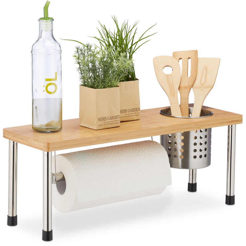 in KüchenorganisationRelaxdays Küchenregal für ArbeitsplatteKüchenrollenhalter & Besteckkorb, Gewürzregal, Bambus & Edelstahl, natur-silber
