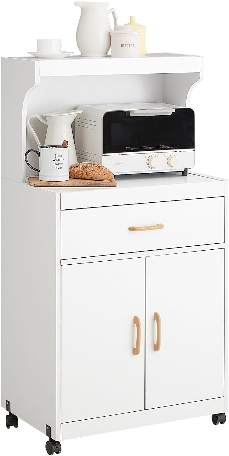 Praktischer Mikrowellenschrank in Weiß aus Holz mit 4 Rollen. Der Schrank ist belastbar bis 60 kg und wiegt ca. 26 kg. Hergestellt aus hochwertigem MDF (E1) und mit den Maßen 62 x 119 x 40 cm ist er ideal für die Küche, das Büro oder als Getränkewagen. Schaffen Sie Ordnung mit Stil und nutzen Sie die Flexibilität des rollbaren Designs. **Highlights** - Vielseitig einsetzbar in Küche, Büro oder als Getränkewagen - Rollbar für flexible Nutzung - Hochwertiges Material: MDF (E1) - Leicht und dennoch belastbar bis 60 kg - Stilvolles Design in Weiß **Produkteigenschaften** - Gewicht: ca. 26 kg - Belastbarkeit: bis 60 kg - Material: MDF (E1) - Produktmaße: BHT ca. 62 x 119 x 40 cm - Paketmaße: ca. 103 x 45 x 8,5 cm **Lieferumfang** - 1 x Küchenschrank - 1 x Anleitung - 1 x Zubehörbeutel