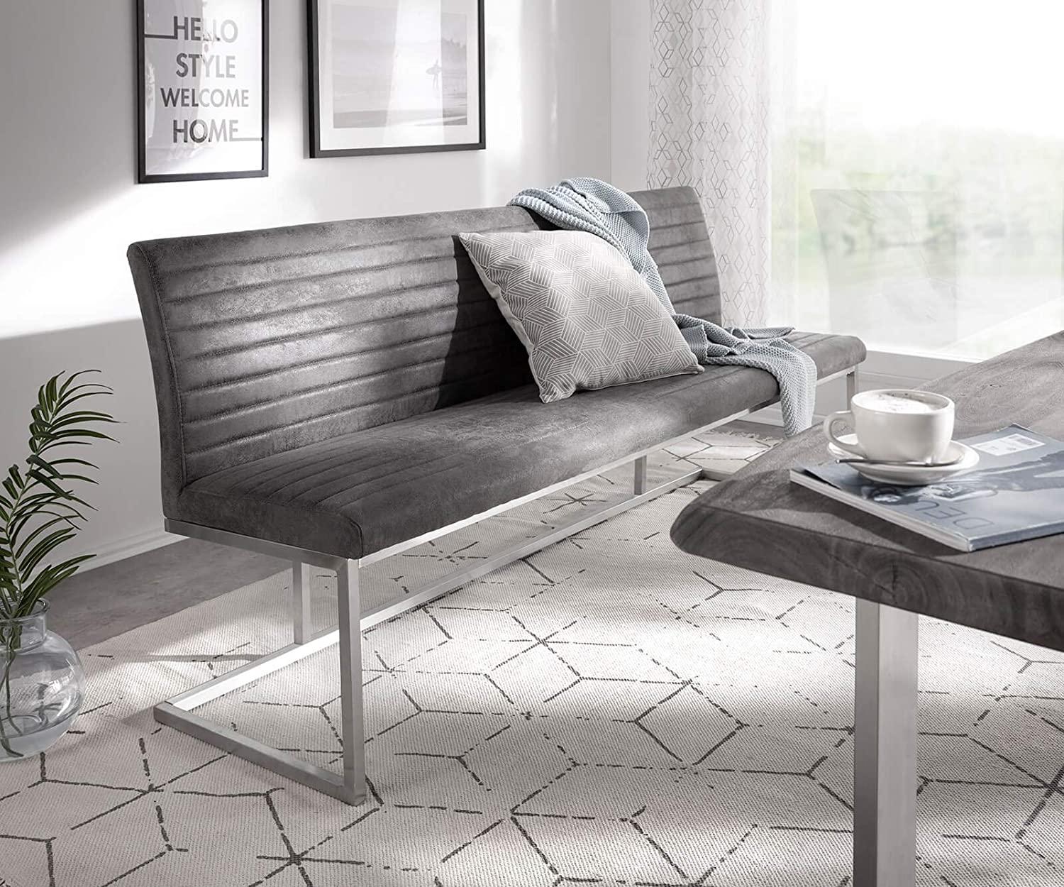 Die elegante Sitzbank Earnest besticht durch ihr modernes Vintage-Design. Die Kombination aus gebürstetem Edelstahlgestell und grauem Mikrofaserbezug mit Quersteppung verleiht der Essbank einen ansprechenden Look. Mit einer Sitzfläche von 200 cm bietet sie genügend Platz und Komfort. **Highlights** - Modernes Vintage-Design - Quersteppung für ein ansprechendes Aussehen - Kombination aus Edelstahl und Mikrofaser - Großzügige Sitzfläche von 200 cm - Hohe Belastbarkeit von 450 kg **Produkteigenschaften** - Maße: B202 x T65 x H90 cm - Sitzhöhe: 50 cm - Sitztiefe: 45 cm - Material: Mikrofaser (100% Polyester) in Vintage Optik, Edelstahlgestell - Polsterung: Schaumpolsterung - Farbe: Grau (Bezug), Silber (Gestell) - Oberfläche: Vintage Optik - Teilmontage erforderlich - Gewicht: 24 kg