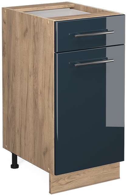 Vicco Küchenschrank Dunkelblau Hochglanz 40 cm ohne Arbeitsplatte, Fame-Line. Dieser Küchenunterschrank überzeugt durch modernes Design und hohe Funktionalität. Mit einer praktischen Schublade bietet er ausreichend Stauraum für Küchenutensilien und Geschirr. Die MDF-Fronten und Soft-Close-Scharnieren sorgen für eine stilvolle Optik und angenehme Bedienung. Der Küchenschrank ist flexibel anpassbar und ergänzt Ihre Küche um ein Stück Luxus. **Highlights** - Modernes Design mit Hochglanz-Oberfläche - Praktische Schublade für optimalen Stauraum - Soft-Close-Scharnieren für sanftes Schließen - Anpassbare Module für individuelle Gestaltung - Hochwertige Materialien für Langlebigkeit **Produkteigenschaften** - Farbe Korpus: Goldkraft Eiche - Farbe Front: Dunkelblau Hochglanz - Maße (BxHxT): 40 x 82 x 51,6 cm - Innenmaße (BxHxT): 368 x 688 x 480 mm - Material: Spanplatte, 16 mm - Zusätzliches Material: MDF - Oberfläche: Melaminharzbeschichtung - Artikelgewicht: 19,32 kg - Artikelgewicht inkl. Verpackung: 21,3 kg **Lieferumfang** - Schubunterschrank als Bausatz - Montageanleitung - Montagematerial - Dekoration nicht im Lieferumfang enthalten