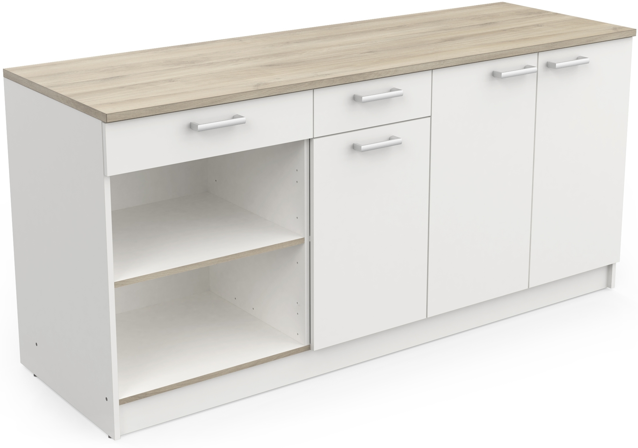 | Lieferumfang | 1x Unterschrank (mit zwei Türen, 2x Schublade, Schrank mit Schwenktür, offenes Regal) |
