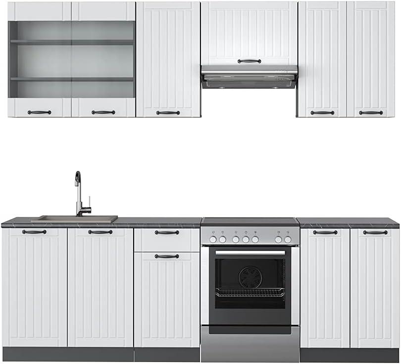 Die Vicco Küchenzeile in Weiß Landhaus und Anthrazit bietet Ihnen eine stilvolle und funktionale Lösung für Ihre Einbauküche. Mit einer Breite von 240 cm und hochwertigen MDF-Fronten ist diese Küchenzeile nicht nur langlebig, sondern auch praktisch. Die Soft-Close-Scharniere und Metall-Vollauszüge sorgen für eine einfache Handhabung und leises Schließen. Diese Küchenmöbelserie lässt sich flexibel an Ihre Bedürfnisse anpassen. **Highlights** - Große Komfortschränke für optimalen Stauraum - Softclose Scharniere für leises Schließen - Metall-Vollauszüge für einfache Handhabung - Stilvolle Griffe als Designelement - Hochwertige MDF-Fronten für Langlebigkeit **Produkteigenschaften** - Farbe Korpus: Anthrazit - Farbe Front: Weiß Landhaus - Abmessungen: 240 x 82 x 52 cm (BxHxT) - Abmessungen Herdumbauschrank: 30 x 82 x 60 cm (BxHxT) - Innenmaße: 268 x 688 x 480 mm - Material: Spanplatte, 16 mm - Zusätzliches Material: MDF - Oberfläche: Melaminharzbeschichtung - Artikelgewicht: 134,94 kg - Artikelgewicht inkl. Verpackung: 148,8 kg **Lieferumfang** - Küchenblock ohne Arbeitsplatte - Montagematerial - Montageanleitung - Elektrogeräte und Dekorationen nicht im Lieferumfang enthalten