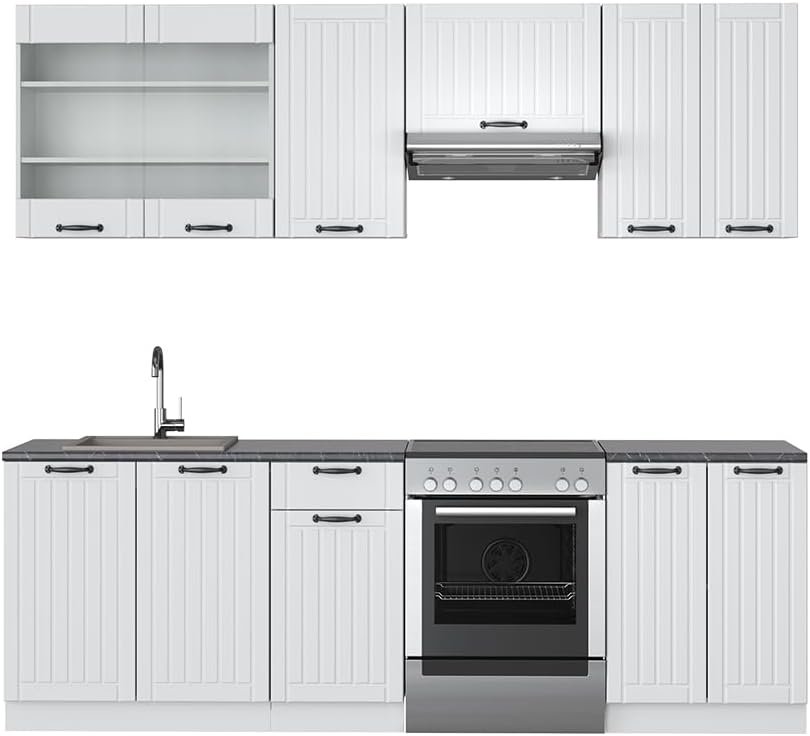 Die Vicco Küchenzeile in Weiß Landhaus bietet Ihnen eine stilvolle und funktionale Lösung für Ihre Einbauküche. Mit einer Breite von 240 cm und einer Höhe von 82 cm ist sie ideal für Hobby- und Profiköche. Die hochwertigen MDF-Fronten und die Soft-Close-Scharniere sorgen für Langlebigkeit und leises Schließen. Die Küchenzeile ist aus robustem Material gefertigt und bietet optimalen Stauraum durch große Komfortschränke. **Highlights** - Große Komfortschränke für optimalen Stauraum - Softclose Scharniere für leises Schließen - Metall-Vollauszüge für einfache Handhabung - Stilvolle Griffe als Designelement - Hochwertige MDF-Fronten für Langlebigkeit **Produkteigenschaften** - Farbe Korpus: Weiß - Farbe Front: Weiß Landhaus - Abmessungen: 240 x 82 x 52 cm (BxHxT) - Abmessungen Herdumbauschrank: 30 x 82 x 60 cm (BxHxT) - Innenmaße: 268 x 688 x 480 mm - Material: Spanplatte, 16 mm - Zusätzliches Material: MDF - Oberfläche: Melaminharzbeschichtung - Artikelgewicht: 134,94 kg - Artikelgewicht inkl. Verpackung: 148,8 kg **Lieferumfang** - Küchenblock ohne Arbeitsplatte - Montagematerial - Montageanleitung - Elektrogeräte und Dekorationen nicht im Lieferumfang enthalten
