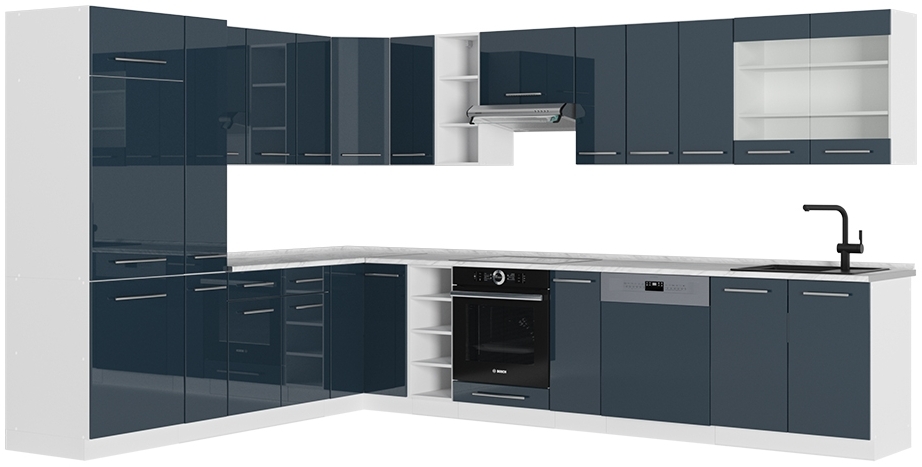 Eckküche Fame-Line Dunkelblau Hochglanz/Weiß 347 x 46 cm ohne Arbeitsplatte Vicco