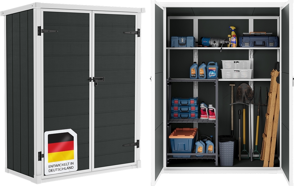 | Name | STEELSØN 'Novara' Gerätehaus Pultdach, Kunststoff, anthrazit, wetterfest, 170/166x68x134 cm, abschließbar, mit 2 Regalböden |