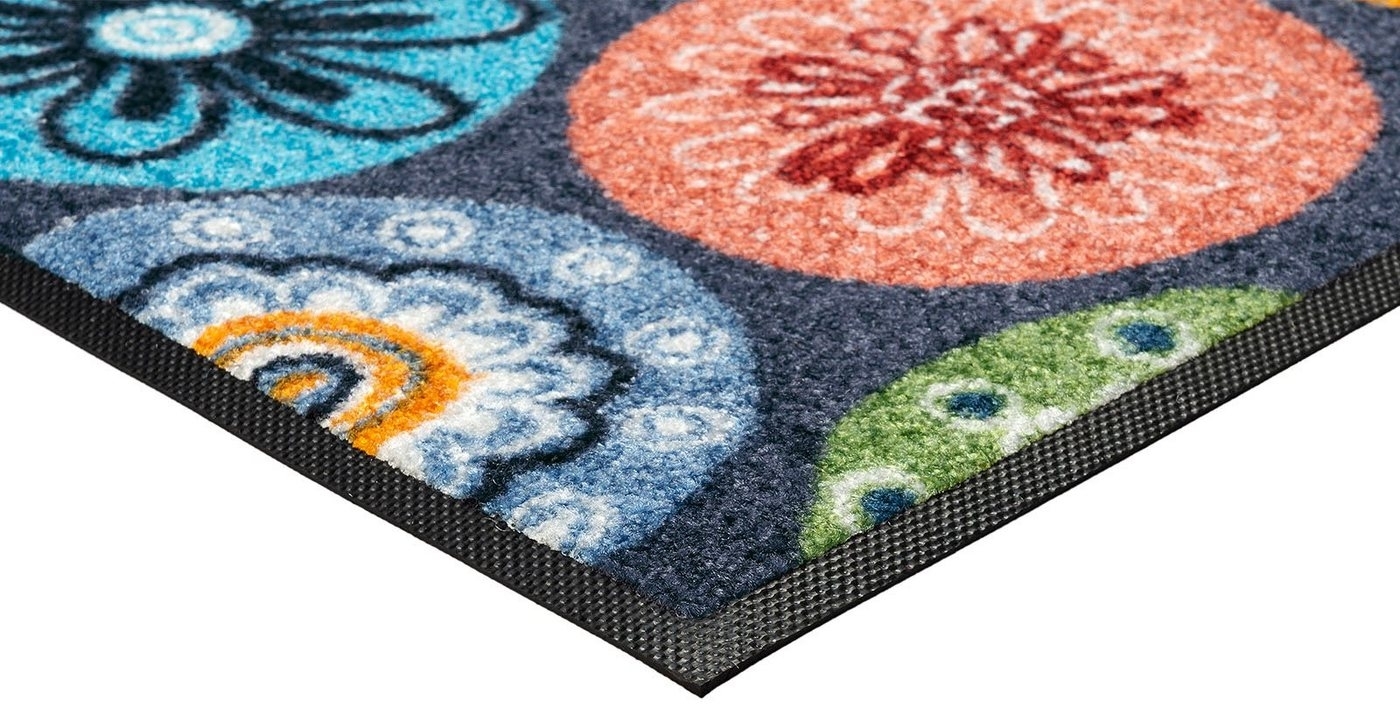 Die wash+dry by Kleen-Tex Fußmatte Coralis ist eine rechteckige Schmutzfangmatte mit einer Höhe von 7 mm. Sie ist sowohl für den Innen- als auch den Außenbereich geeignet und bietet durch ihr fröhliches Blumendesign einen einladenden Blickfang. Der dichte Flor aus strapazierfähigem Polyamid sorgt für hohe Feuchtigkeits- und Schmutzaufnahme, während der rutschhemmende Rücken sicheren Halt auf glatten Böden gewährleistet. Die Matte ist waschbar bis 60 °C und trocknergeeignet. **Highlights** - Fröhliches Blumendesign für einen einladenden Eingangsbereich - Rutschhemmender Rücken für sicheren Halt auf glatten Böden - Waschbar bis 60 °C für einfache Reinigung - Trocknergeeignet für schnelle Nutzung - 5 Jahre Herstellergarantie für langlebige Qualität **Produkteigenschaften** - Höhe: 7 mm - Material: Polyamid - PVC-frei - In- und Outdoor geeignet - Hohe Feuchtigkeits- und Schmutzaufnahme