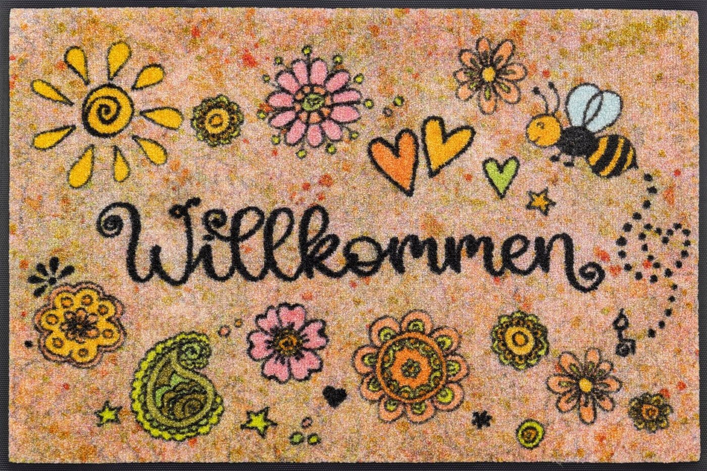 Die wash+dry by Kleen-Tex Fußmatte "Bring Glück herein" vereint Funktionalität und ansprechendes Design. Mit einer Höhe von 7 mm und einem flachen, dichten Flor aus Polyamid nimmt sie zuverlässig Schmutz und Feuchtigkeit auf. Die rutschhemmende Rückenbeschichtung aus Nitrilgummi sorgt für sicheren Stand. Pflegeleicht kann die Matte bei bis zu 60 Grad in der Waschmaschine gereinigt werden. Ideal für Eingänge, Flure, Balkone und Wintergärten. **Highlights** - Design von Tina Hötzendorfer, das Freude und Farbe in den Alltag bringt - Rutschhemmende Rückenbeschichtung aus Nitrilgummi für sicheren Stand - Pflegeleicht: waschmaschinenfest bis 60 Grad und trocknergeeignet - 100% PVC-frei für eine umweltfreundliche Nutzung - Individuell einsetzbar in verschiedenen Bereichen des Hauses **Produkteigenschaften** - Maße: 50 x 75 cm oder 35 x 75 cm - Höhe: 7 mm - Material: Polyamid - Rückenbeschichtung: Nitrilgummi - Pflegehinweis: 3 bis 4 Mal jährlich waschen, bei starker Belastung häufiger - Für Saugroboter geeignet - Produktionsbedingte Toleranz in der Größe von +/- 3%