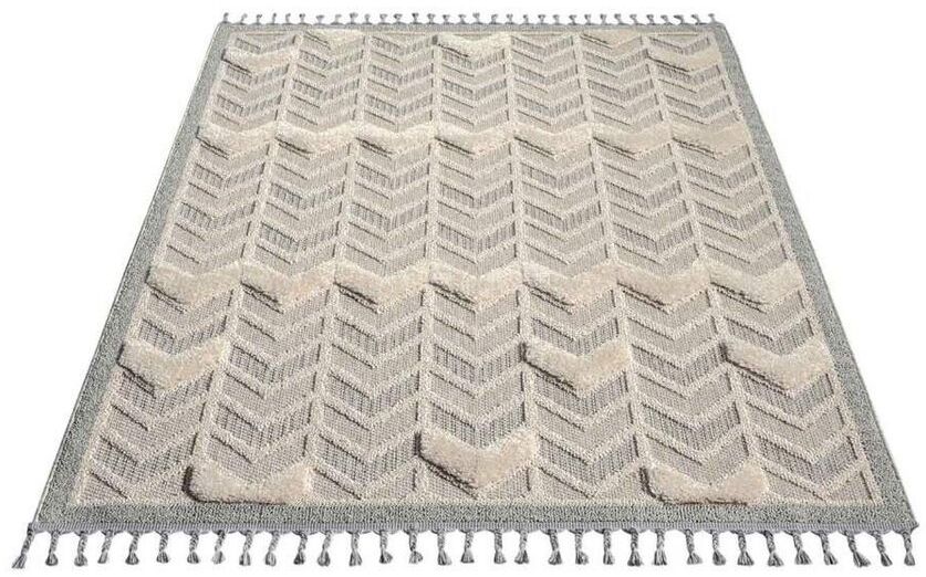 Ein moderner Boho-Teppich in Creme und Graublau, der mit seinem geometrischen Muster und der Relief-Optik besticht. Die Cut-&-Loop Herstellung sorgt für einen einzigartigen 3D-Effekt. Hergestellt aus 45% Sisal und 55% Polypropylen, bietet er eine Florhöhe von ca. 20 mm und ein Gewicht von ca. 1,85 kg/m². Ideal für Wohnzimmer, Schlafzimmer, Esszimmer oder Flur, ist er strapazierfähig, pflegeleicht und für Fußbodenheizungen geeignet. **Highlights** - Geometrisches Muster mit 3D-Effekt: Verleiht dem Teppich eine einzigartige Optik. - Cut-&-Loop Herstellung: Sorgt für eine raffinierte Relief-Optik. - Sisal und Polypropylen Materialmix: Kombiniert natürliche und synthetische Fasern für Langlebigkeit. - Vielseitig einsetzbar: Perfekt für verschiedene Räume wie Wohnzimmer, Schlafzimmer und Flur. - Schadstoffgeprüft: Für ein gesundes Raumklima. **Produkteigenschaften** - Maße: 160 x 230 cm - Material: 45% Sisal, 55% Polypropylen - Florhöhe: ca. 20 mm - Gewicht: ca. 1,85 kg/m² - Weiche Haptik - Strapazierfähig - Pflegeleicht - Fußbodenheizung geeignet - Maß kann +/- 3 cm abweichen