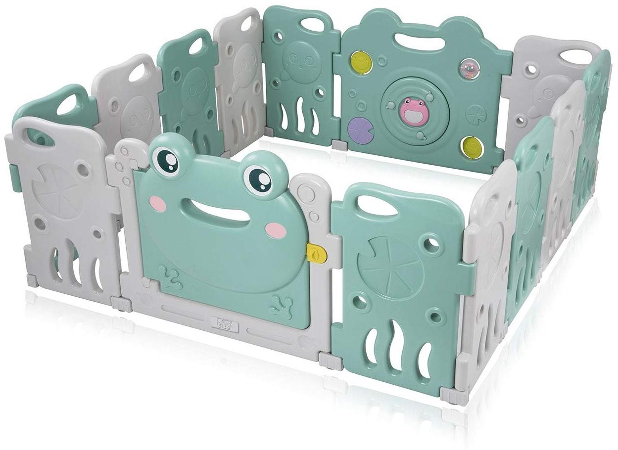 Das Laufgitter für Kinder 'Fridolin' besteht aus robustem Kunststoff, der für hohe Stabilität sorgt. Das Schutzgitter von Baby Vivo verfügt im unteren Bereich über Saugnäpfe, die für einen besseren Halt sorgen, wenn Sie einen Fußboden mit Fliesen, Parkett oder Laminat haben - so können Sie den Laufstall flexibel aufstellen, wo Sie ihn gerade brauchen. Die einzelnen Elemente von 'Fridolin' sind abgerundet, sodass Sie keine scharfen Kanten befürchten müssen. Ein Element des Gitters enthält ein integriertes Spielzeug, das Ihr Kind bestimmt schnell erkundet. Zusätzlich dazu ist auch eine Tür enthalten. **Eigenschaften:** - Gesamtmaße ca.: 154 x 154 x 62 cm (L x B x H) - Flächeninhalt: ca. 2,69 m² - Maße (Türelement und Spielelement) ca.: je 79 x 67 x 8 cm (B x H x D) - Maße Seitenelemente ca.: 41,5 x 62 x 3,5 cm (B x H x D) - Ein Türelement und ein Element mit integriertem Spielzeug - Altersempfehlung: Für Kinder von 0 bis 6 Jahren geeignet Bitte lassen Sie Ihr Kind niemals unbeaufsichtigt alleine im Laufgitter spielen!
