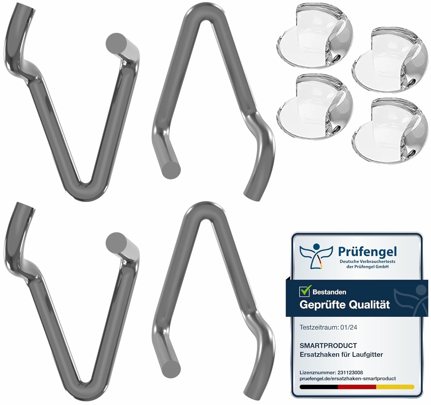 | Name | SmartProduct Höhenversteller Haken für Laufgitter – Verzinkter Ersatzhaken von Stahl, Ersatzversteller 4er-Pack für mehrere Höhenverstellung Laufstall und 4 x transparente Eckschützer - PVC Möbel |