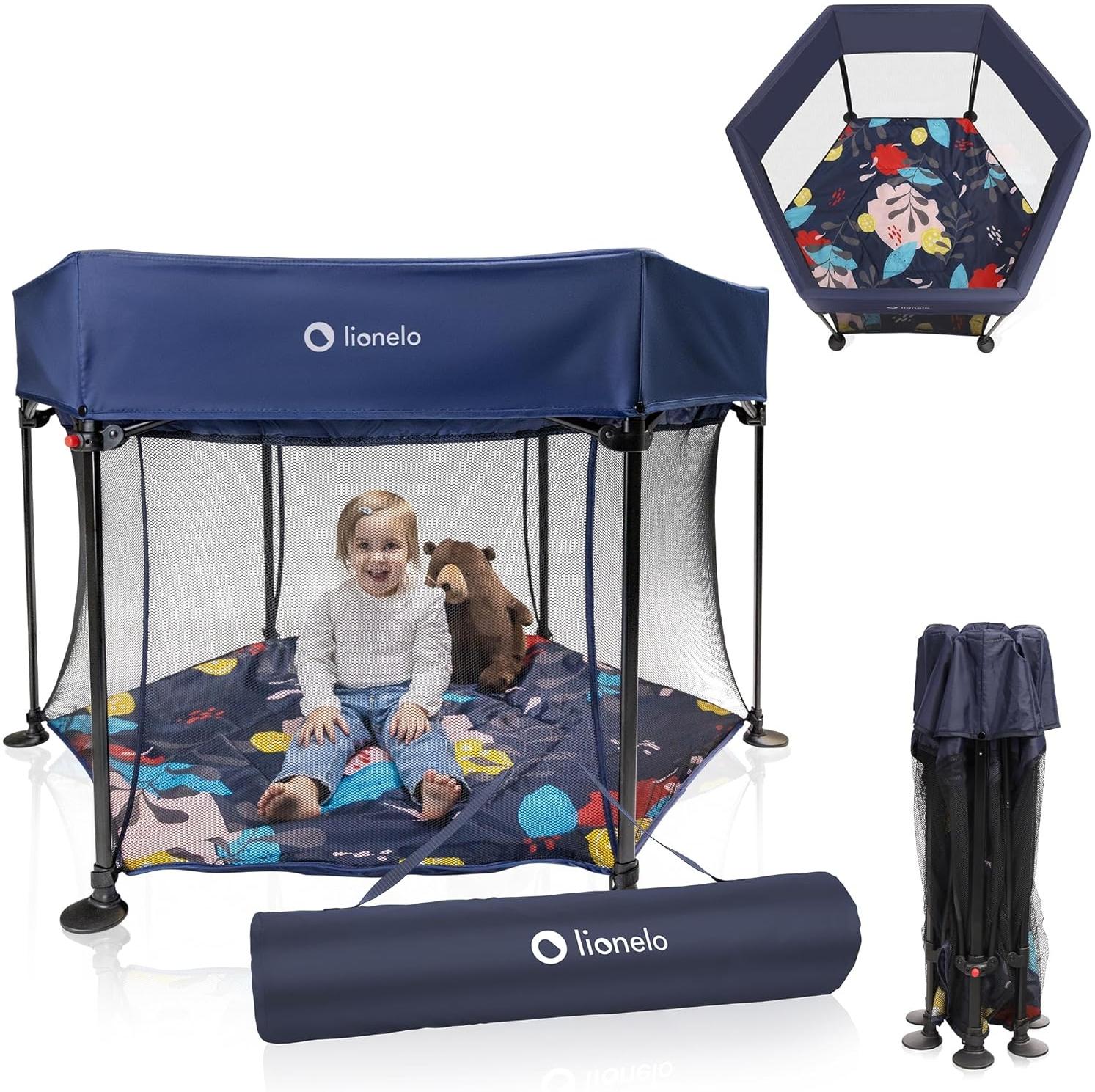 in LaufgitterLIONELO Roel Laufstall Baby bis zu 15 kg Großformat 135x85 cm, sechseckige Form, LockGuard Faltschloss, verstärkte Basis, rutschfeste Fußkappen, Schutztasche