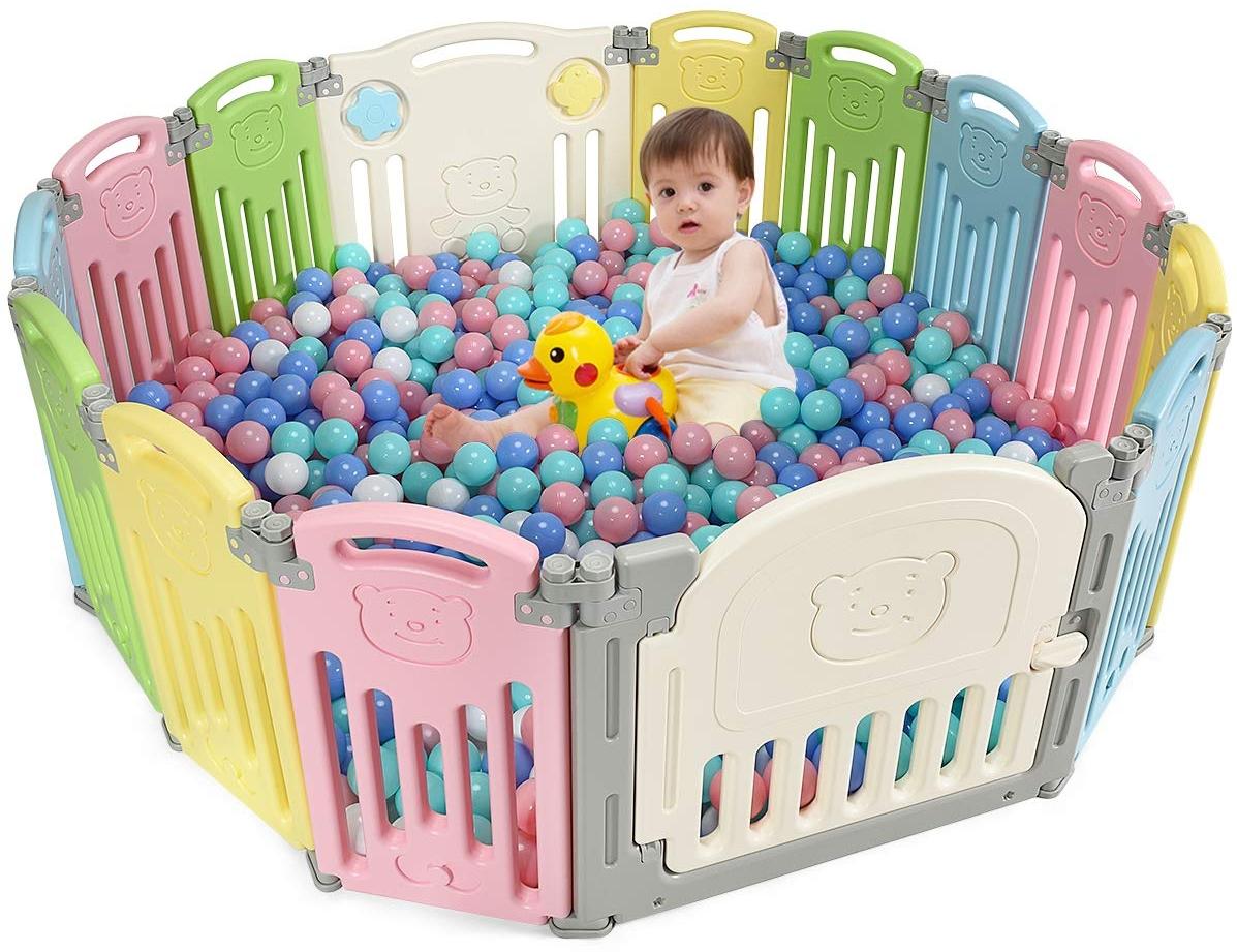 | Name | COSTWAY Laufgitter aus Kunststoff, mit Tür und Spielzeugboard Bunt/14 Elemente |