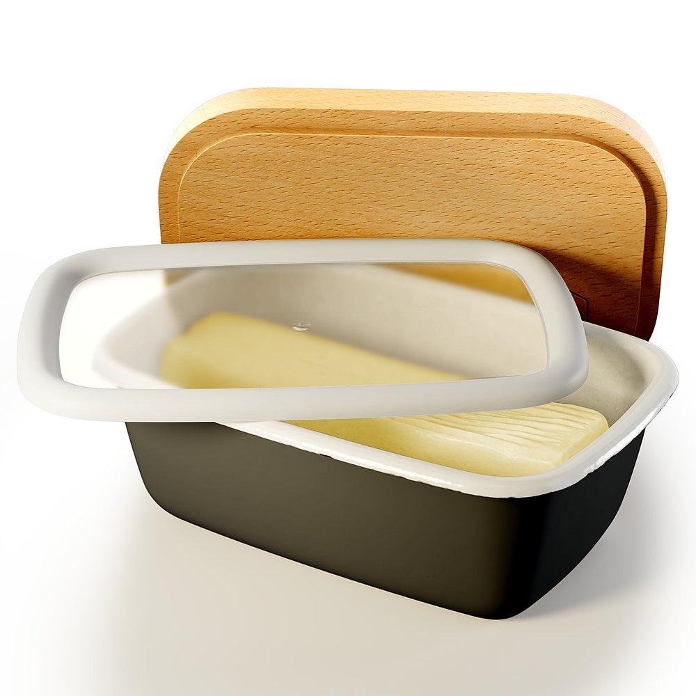 Emaille-ButterdoseHolzkohle, mit Deckel aus Buchenholz und Kunststoff-Aufbewahrungsdeckel ? Butterboot, Keeper