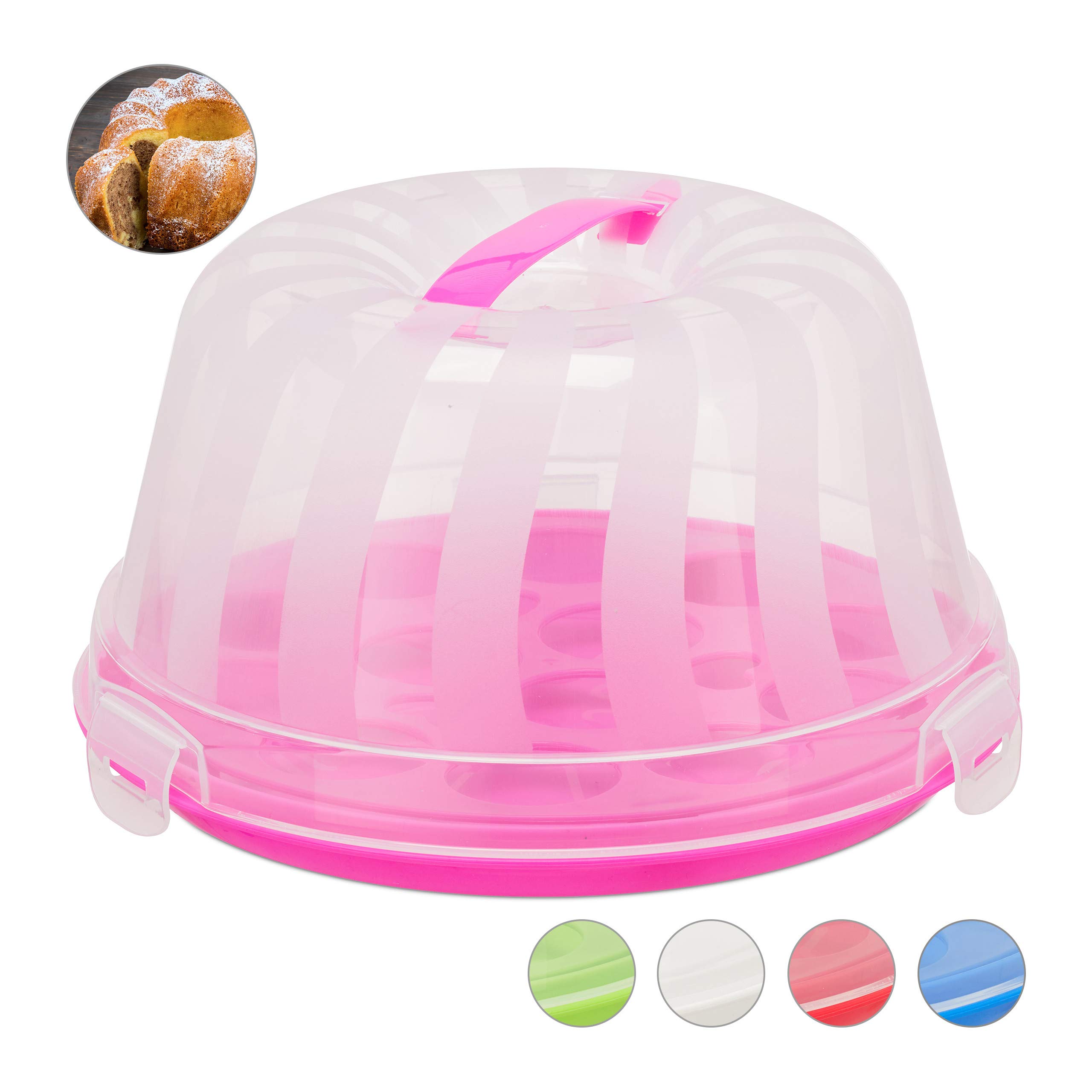Relaxdays Kuchenboxrund, Henkel, Gugelhupf, Kuchen & Torten, Muffin Transportbox, HxD 15,5 x 28,5cm, pink-transparent