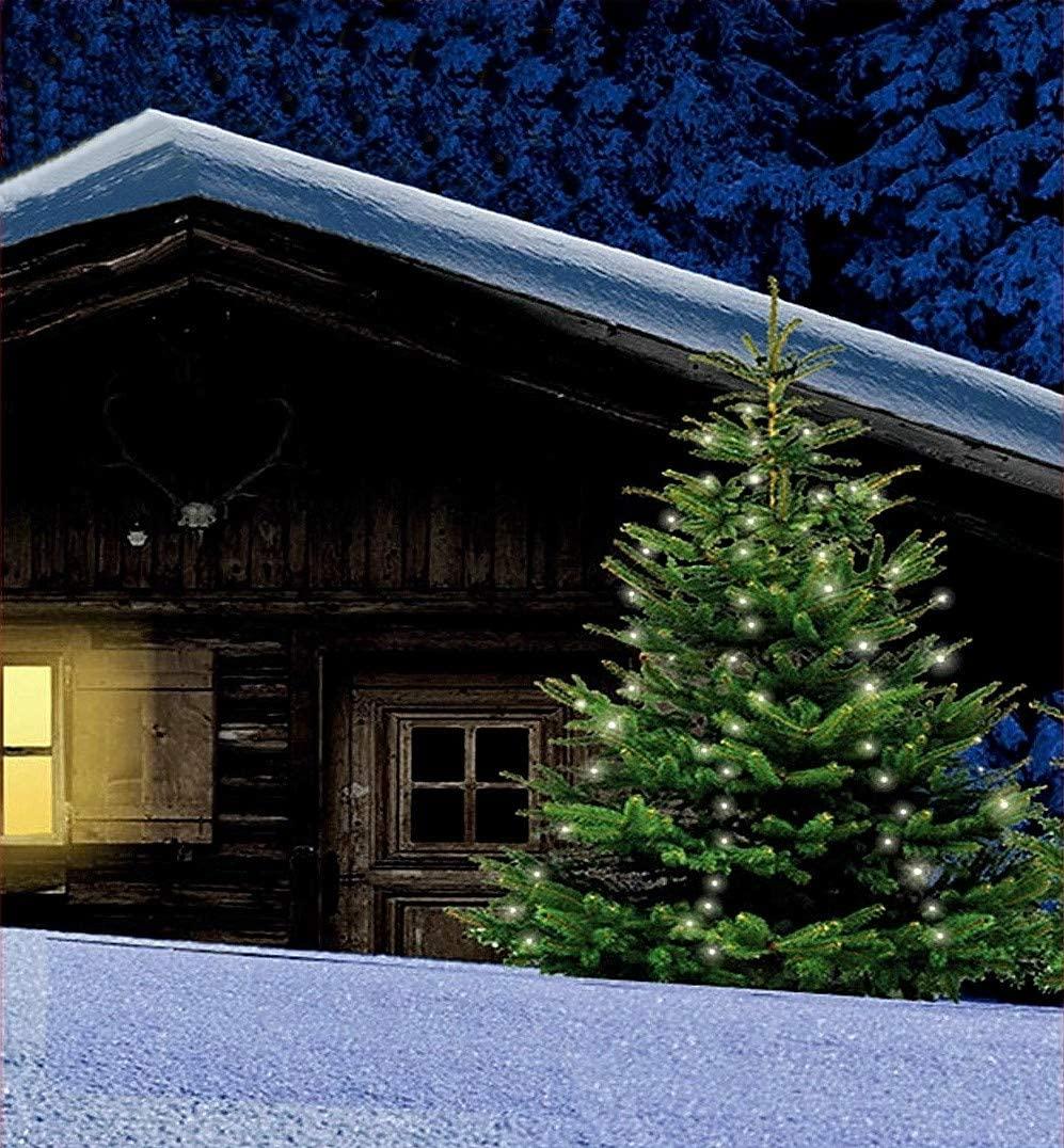 Diese LED Lichterkette verwandelt Ihren Baum oder Ihre Tanne in einen strahlenden Lichterbaum. Sie besteht aus 8 Strängen mit je 20 warmweißen LEDs und einer Länge von ca. 2 m pro Strang. Mit einer großzügigen Zuleitung von 5 m und einem spritzwassergeschützten IP44 Adapter ist sie ideal für den Außenbereich geeignet. Die integrierte Timerfunktion schaltet die Beleuchtung automatisch für 6 Stunden ein und 18 Stunden aus. Empfohlen für Bäume bis 2,2 m Höhe. **Highlights** - 160 LEDs für eine beeindruckende Beleuchtung - Timerfunktion für automatisches Ein- und Ausschalten - Spritzwassergeschützter IP44 Adapter für den Außenbereich - Lange Zuleitung von 5 m für flexible Anbringung - Hohe Lebensdauer von ca. 20.000 Stunden **Produkteigenschaften** - Anzahl Lichter: 160 LEDs - Länge pro Strang: ca. 2 m - Anzahl Stränge: 8 Stück - Metallring Durchmesser: ca. 7 cm - Abstand zwischen den LEDs: ca. 10 cm - Kabelfarbe: dunkelgrün - Lichtfarbe: warmweiß - Einsatz: Außenbereich - Empfohlen für Bäume bis 2,2 m Höhe **Lieferumfang** - 1 LED Lichterkette Weihnachtsbaum - IP44 Adapter - Lieferung erfolgt ohne evtl. abgebildete Dekoration