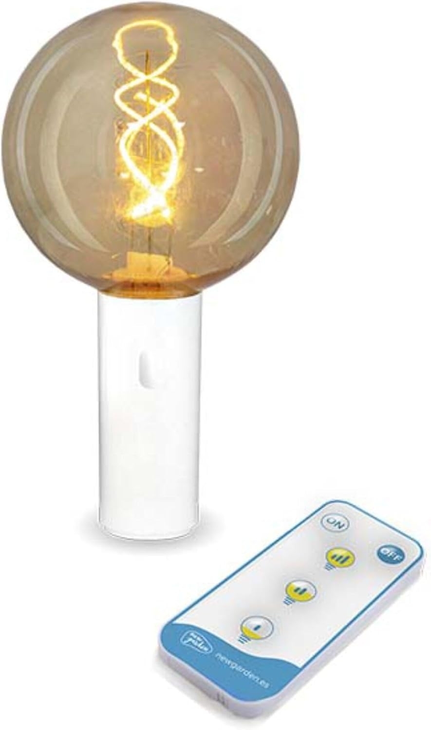 Die kabellose New Garden EDY BULB G125 Battery in Weiß ist eine tragbare Vintage-Lampe, die sich mühelos aufhängen oder an metallischen Flächen befestigen lässt. Mit einer Leuchtkraft von 400 Lumen und einer Betriebsdauer von bis zu 25 Stunden bietet sie vielseitige Einsatzmöglichkeiten. Die Lampe ist dimmbar und wird mit einer Fernbedienung geliefert, um das Licht bequem zu steuern. Ihre widerstandsfähige Kunststoffbeschichtung simuliert Rauchglas und sorgt für eine ansprechende Optik. **Highlights** - Kabellose, tragbare Lampe für flexible Nutzung - Magnetischer Sockel für einfache Befestigung - Dimmbar mit Fernbedienung für individuelle Lichtstimmung - Hohe Leuchtkraft von 400 Lumen - IP54 Schutzindex für Innen- und Außenbetrieb **Produkteigenschaften** - Lichtfarbe: 2700 K - Abstrahlwinkel: 270° - Lademethode: USB - 5VDC Eingang (USB-C-Ladekabel im Lieferumfang enthalten) - 5V / 2A max. Ladeadapter erforderlich (nicht im Lieferumfang enthalten) - Akkuladung Laufzeit: bis zu 25 Stunden - Lebenszyklus: ca. 25.000 Stunden - Ladezyklen: ca. 700 - Leistung: 3 W - Schutzindex: IP54 **Lieferumfang** - New Garden EDY BULB G125 Battery - Fernbedienung - USB-C-Ladekabel - Ladeadapter nicht im Lieferumfang enthalten