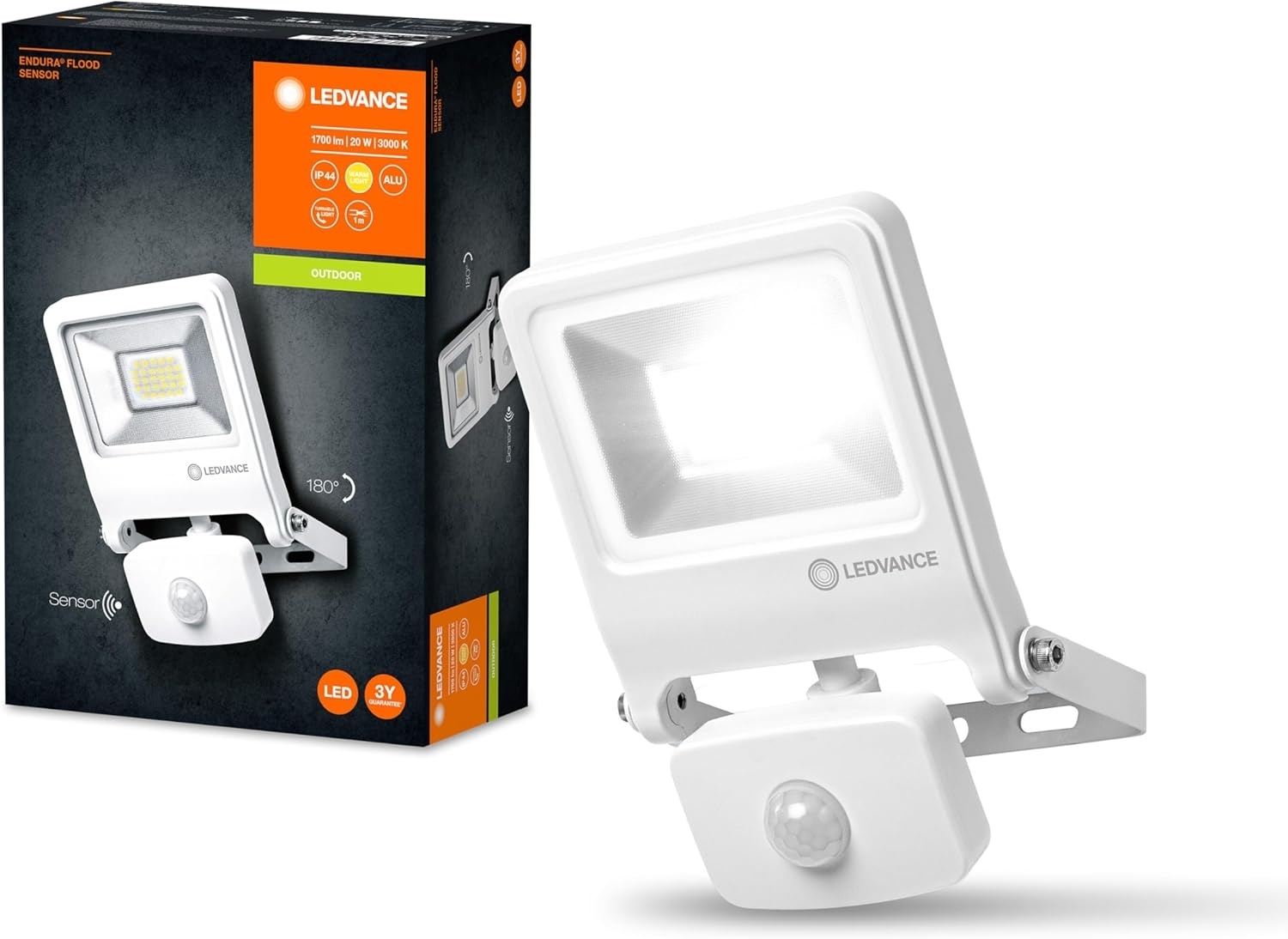 Die LEDVANCE ENDURA® FLOOD Sensor Warm White 20 W 3000 K WT sind sehr helle und funktionelle LED-Außenleuchten mit einem symmetrischen Ausstrahlungswinkel von 110° x 110°. Sie können mit dem Montagebügel flexibel um bis zu 180° gedreht werden. Die Leuchten sind in einer Version mit weißem oder dunkelgrauem Gehäuse erhältlich und werden über ein 1 m langes Kabel angeschlossen. Ein besonderes Highlight ist der einstellbare IR-Tageslicht- und Bewegungssensor mit einer Reichweite von bis zu 9 m. Dadurch wird die Beleuchtung automatisch aktiviert, wenn sich jemand nähert, und spart Energie. Die LEDVANCE ENDURA® FLOOD Sensor Warm White 20 W 3000 K WT bieten eine Gewichts- und Größenoptimierung durch ihr kompaktes Design und eine Energieersparnis von bis zu 80 % im Vergleich zu Halogenlampen-Flutern. Die teilmattierte Abdeckung aus gehärtetem Glas sorgt für eine gleichmäßige Beleuchtung. Diese Außenleuchten eignen sich ideal für den Einsatz im Freien (IP44) und können Halogenlampen-Fluter ersetzen. Sie sind perfekt für die Beleuchtung von Garagen und zur Anstrahlung von Fassaden geeignet. **Highlights** - Einstellbarer IR-Tageslicht- und Bewegungssensor mit einer Reichweite von bis zu 9 m - Gewichts- und Größenoptimierung durch kompaktes Design - Energieersparnis von bis zu 80 % im Vergleich zu Halogenlampen-Flutern - Symmetrischer Ausstrahlungswinkel von 110° x 110° - Teilmattierte Abdeckung aus gehärtetem Glas für eine gleichmäßige Beleuchtung **Produkteigenschaften** - Sehr helle und funktionelle LED-Außenleuchten - Montagebügel mit Rotationsbereich von bis zu 180° - Umgebungstemperaturbereich bei Betrieb: -10…+40 °C - Versionen mit weißem oder dunkelgrauem Gehäuse verfügbar - Anschluss über Kabel (1 m), Verdrahtung erforderlich - Anwendungsgebiete: Außenanwendung (IP44), Garagen, Anstrahlung von Fassaden