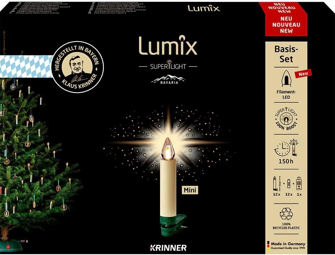 Krinner Super Light Bavaria Mini Basis, Flame 12er Set Elfenbein Eigenschaften: -Filament-LED: Helles, warmes und flammenähnliches Licht -Dauerlicht- und zweifacher Flackermodus, dimmbar -Super Light-Modus für helleres Licht -4h Ausschalt-Funktion -In- & Outdoor (IP44) -21 Tage Leuchtdauer bei 4 Stunden täglicher Einschaltzeit oder über 150 Stunden im Dauerbetrieb -Beliebig viele Basis- und Erweiterungssets der IR-Serie miteinander kombinierbar -Gesamthöhe: 9 cm -Griffiger Halteclip -LED-Kopf austauschbar -Einzelgewicht Kerze: 22 g Set bestehend aus: -12x elfenbeinfarbene Mini LED Kerzen -12x Alkaline Batterien (Typ Micro / LR03 / AAA) -1x silberfarbene Super Light Fernbedienung Art (inkl. 1x CR2032 Batterie)