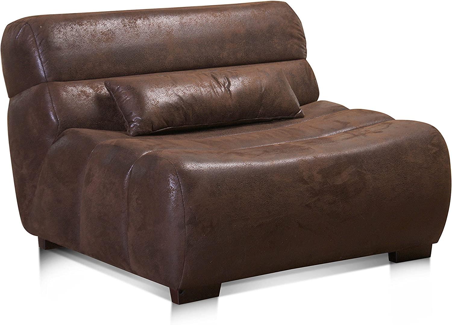| Beschreibung | Der Cavadore Sessel Scoutano in Antiklederoptik ist ein stilvoller XXL-Sessel im Industrial Design. Mit seinen großzügigen Maßen von 114 x 76 x 108 cm (BxHxT) bietet er viel Platz zum Entspannen. Der Sessel ist ohne Lehne gestaltet und überzeugt durch eine komfortable Wellenunterfederung sowie atmungsaktive Polyurethanschaum-Polsterung. Der Bezug aus Mikrofaser Antik in der Farbe Chocco (braun) sorgt für eine angenehme Haptik, während die Holzfüße in antikem Nusbaum das Gesamtbild abrunden. **Highlights** - XXL-Sessel ohne Lehne im Industrial Design - Hoher Sitzkomfort dank Wellenunterfederung und Polyurethanschaum-Polsterung - Bezug in Antiklederoptik mit weicher Haptik - Frei im Raum stellbar - Holzfüße in antikem Nusbaum **Produkteigenschaften** - Größe: 114 x 76 x 108 cm (BxHxT) - Bezug: Mikrofaser Antik (100 % Polyester) - Farbe: Chocco (braun) - Material: Holz - Industrial Design **Lieferumfang** - Cavadore 478 - Sessel Scoutano (ohne Zierkissen) - Füße in Holz nusbaumfarben antik |