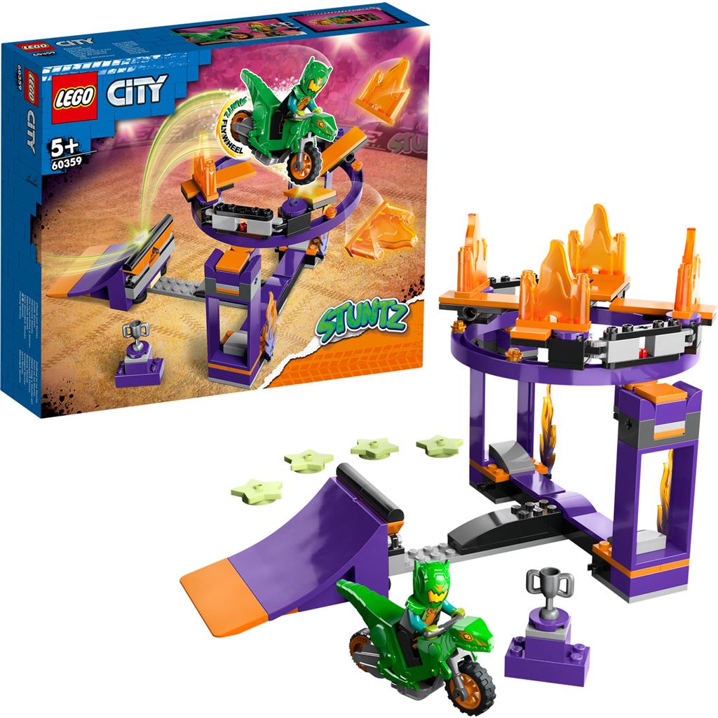Mit der LEGO® City Sturzflug-Challenge (60359) erwarten dein Kind unzählige spektakuläre Stunts. Dein Kind bringt den Sprungreifen in eine senkrechte oder waagerechte Position, aktiviert das Schwungrad und lässt das Stuntbike über die Rampe springen und atemberaubende Stunts vorführen. Das Spielset beinhaltet auch einen LEGO City Stuntz Fahrer. **Bau- und Spielspaß für Kinder ab 5 Jahren** Diesem LEGO City Stuntz Spielset liegt eine verständliche Bauanleitung bei. Außerdem sind in der LEGO Builder App intuitiv nutzbare Vergrößerungs- und Drehfunktionen verfügbar, die dein Kind beim Bauen digitale Modellansichten aus jedem Winkel betrachten lassen. **Die Kinder sind die Stars der Show!** LEGO City Spielsets beinhalten realistische Fahrzeuge, detailreiche Konstruktionen und faszinierende Figuren für spannende Rollenspiele. Kombiniere diese Modelle für noch größere Stuntshows mit den anderen LEGO City Stuntz Spielsets. - Spannende echte Stunts für Kinder: Die LEGO® City Sturzflug-Challenge (60359) ist genau die richtige Kulisse für atemberaubende Stuntshows und spektakuläre Wettbewerbe - Inhalt der Box: Dieses LEGO® City Stuntz Bau- und Spielset beinhaltet einen waagerecht oder senkrecht positionierbaren Reifen, eine Rampe, ein Stuntbike mit Schwungrad und eine Fahrer-Minifigur - Kinder können spannende Wettbewerbe austragen: Die Spieler lassen die Stuntbikes über die Rampe flitzen und von oben durch den waagerecht positionierten Feuerreifen krachen oder durch den senkrechten Sternenring fliegen - Tolles Geschenk für Kinder, die Actionspielzeug lieben: Dieses LEGO® City Stuntz Spielset ist ein ganz besonderes Geburtstags- oder Überraschungsgeschenk für Kinder ab 5 Jahren - Abmessungen: Mit aufgesteckten Flammen ist der waagerecht befestigte Reifen 15 cm hoch, 16 cm breit und 25 cm tief - LEGO® Minifiguren-Zubehör: Dieses Set beinhaltet einen Minifiguren-Helm und einen Siegerpokal - Gedruckte und digitale Bauanleitungen: In der LEGO® Builder App für Smartphones und Tablets sind Funktionen verfügbar, die dein Kind beim Bauen digitale Ansichten der Modelle vergrößern, drehen und aus jedem Winkel betrachten lassen - Spielen fördert die Kreativität deines Kindes: LEGO® City Stuntz Spielsets lassen Kinder besonders fantasievoll mit Konstruktionen, Fahrzeugen und Figuren spielen - Garantierte Qualität seit 1958: Alle LEGO® Elemente entsprechen strengsten Branchenstandards, damit sie einheitlich und kompatibel sind und großen Bauspaß bieten - Sicherheit hat Vorrang: LEGO® Elemente werden Fall-, Hitze-, Druck- und Torsionstests unterzogen und analysiert, damit sie strengen globalen Sicherheitsstandards entsprechen
