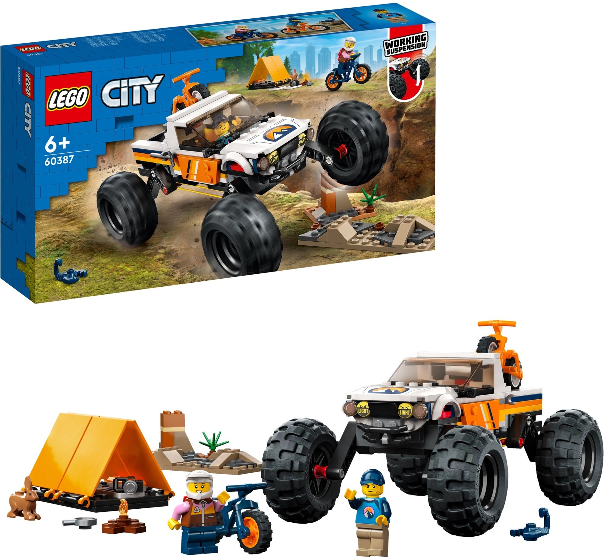 - Das LEGO City Offroad Abenteuer (60387) enthält einen 4x4 Geländewagen mit großen Reifen und hoher Federung für aufregende Geländefahrten.