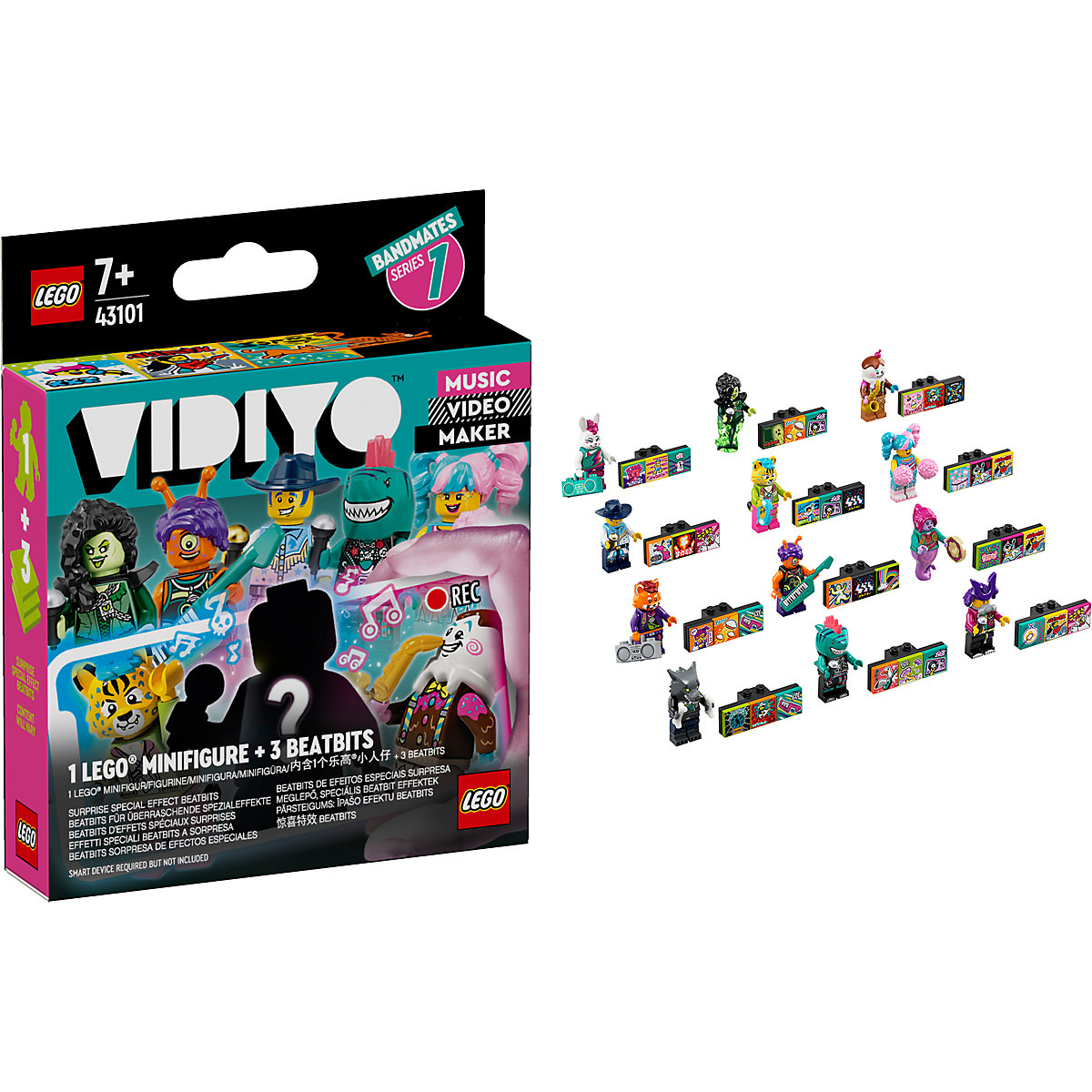 **LEGO® VIDIYO™ Bandmates** (43101) Minifiguren und die dazugehörige VIDIYO App machen Kinder zu Regisseuren, Produzenten und Stars ihrer eigenen Musikvideos. Kinder können 12 verschiedene Charaktere aus unterschiedlichen Musikgenres sammeln. Ihre Band aus Minifiguren besteht aus Tänzern, Rappern, Gitarristen, Schlagzeugern und Sängern. Mithilfe der sicheren VIDIYO App erwecken Kinder ihre gescannten Spielzeugfiguren im Video zum Leben. **BeatBits für faszinierende Effekte** Jedes Bandmate besitzt seine ganz eigene Persönlichkeit. Scanne die 3 beiliegenden BeatBits mit der App, um Effekte und Sounds in dem Video freizuschalten. Die Auswahl der Songs wird regelmäßig aktualisiert, um den Kindern beim Spielen genügend Abwechslung zu bieten. **Teile deine Musikvideos online** Die LEGO® VIDIYO™ App beinhaltet diverse Sicherheitsstandards, die Kinder online schützen. Avatare und von der App generierte Nutzernamen bewahren die Anonymität der Kinder. Alle hochgeladenen Videos und Kommentare werden von unserem Team geprüft. Auf dem Eltern-Dashboard legen Erwachsene fest, worauf ihr Kind zugreifen kann und was das Kind teilen darf. - Mit den LEGO® VIDIYO™ Bandmates (43101) und der dazugehörigen VIDIYO App können Kinder coole Musikvideos drehen und über den sozialen Feed der App mit anderen Kindern teilen. Ein völlig neues Spielerlebnis! - Lade dir die kostenlose LEGO® VIDIYO™ App herunter und scanne damit die Minifigur, sowie die BeatBits für tolle Spezialeffekte in deinem Musikvideo. Kinder werden es lieben zu sehen, wie ihre Figur zum Leben erwacht. - Jeder LEGO® VIDIYO™ Bandmates Minifigur liegen 3 BeatBits zum Scannen bei, die in der App Spezial- und Soundeffekte freischalten oder auch der Figur das Kostüm wechseln lassen. Kinder können bis zu 92 verschiedene BeatBits sammeln. - LEGO VIDIYO™ Bandmates Minifiguren ermöglichen es Kindern im Zusammenspiel mit der App kreativ zu werden und bieten viel Abwechslung. Deshalb sind die Spielzeugfiguren ein tolles Geschenk für Jungen und Mädchen ab 7 Jahren, die Musik lieben und gerne auf der Bühne stehen. - Die LEGO® VIDIYO™ App beinhaltet diverse Sicherheitsstandards, die Kinder beim Online-Spiel schützen, beispielsweise ein Eltern-Dashboard, anonyme Nutzernamen und eine Prüfung der Kommentare. - Jede Überraschungsbox beinhaltetet 1 Bandmate Minifigur, 2 zufällige BeatBits und 1 spezielles BeatBit, 1 Zubehörteil, eine Bühne aus LEGO Steinen mit Platz für 3 BeatBits, eine Bauanleitung und eine Sammlerbroschüre. - Die LEGO® VIDIYO™ App ist mit ausgewählten iOS- und Android-Geräten kompatibel. Kompatibilitätscheck auf www.LEGO.com/devicecheck. Kinder sollten ihre Eltern um Erlaubnis bitten, bevor sie online gehen. - Eine Vorauswahl ist leider nicht möglich. Die Auswahl erfolgt zufällig.