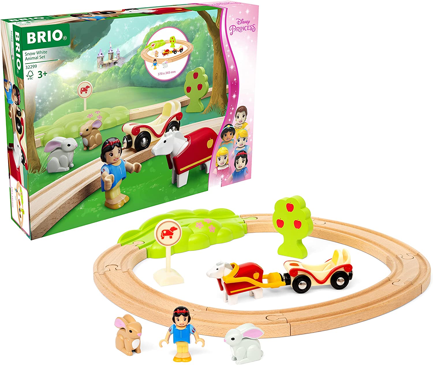 - BRIO Disney Princess Schneewittchen-Eisenbahnset enthält 17 Teile, darunter eine Schneewittchen-Figur, einen Waggon und ein Pferd.