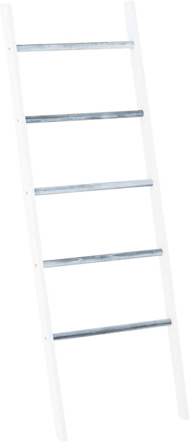 Die Treppenregal Mariette V2 in Weiß/Grau ist eine stilvolle Dekoleiter im romantischen Landhausstil. Sie bietet durch ihr schlichtes Design vielseitige Einsatzmöglichkeiten im Schlafzimmer, Flur oder Badezimmer. Mit fünf Sprossen aus Paulownia, auch Blauglockenholz genannt, ist sie ideal für Haken, Kleidung und Handtücher. Das feuchtigkeitsresistente Material sorgt für Langlebigkeit. Bitte beachten Sie, dass Dekoration und Haken nicht im Lieferumfang enthalten sind und die Leiter zerlegt geliefert wird. **Highlights** - Romantischer Landhausstil - Vielseitig einsetzbar im Schlafzimmer, Flur oder Badezimmer - Fünf Sprossen für zusätzlichen Stauraum - Hergestellt aus feuchtigkeitsresistentem Paulownia - Zerlegt geliefert für einfache Montage **Produkteigenschaften** - Gesamtbreite: 50 cm - Gesamttiefe: 43 cm - Gesamthöhe: 146 cm - Sprossenbreite: 46 cm - Maße der Holzsprossen: - 1) 35 cm - 2) 59 cm - 3) 86 cm - 4) 107 cm - 5) 131 cm **Lieferumfang** - Dekoleiter Mariette V2 (zerlegt) - Dekoration und Haken sind nicht enthalten