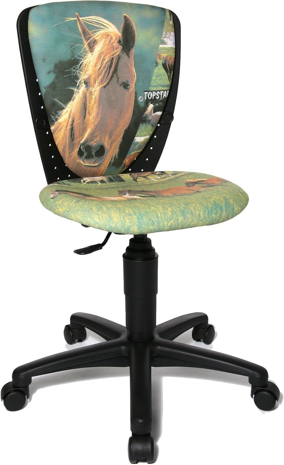 - Der Topstar 'cool 3' Kinderdrehstuhl Sferde ist in einem ansprechenden Schwarz mit einem Pferdemotiv gestaltet.