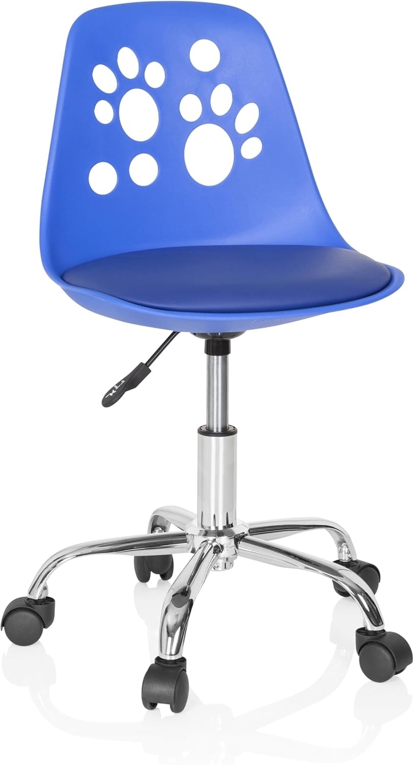 Der hjh OFFICE 742005 Kinderdrehstuhl Fancy I in Blau ist ein mitwachsender Drehstuhl, der durch sein peppiges Design und das süße Tiermotiv mit Katzenpfoten in der Rückenlehne besticht. Er eignet sich für Kinder ab einer Körpergröße von ca. 110 cm. Die ergonomisch geformte Rückenlehne und die Sitzschale aus robustem Kunststoff bieten hohen Sitzkomfort. Die stufenlos einstellbare Sitzhöhe und das stabile Fußkreuz aus verchromtem Stahl runden das Gesamtbild ab. **Highlights** - Mitwachsender Drehstuhl im peppigen Design - Süßes Tiermotiv in der Rückenlehne mit Katzenpfoten - Ergonomisch geformte Rückenlehne und Sitzschale aus robustem Kunststoff - Bequem gepolsterte Sitzfläche mit leicht zu reinigendem Kunstleder-Bezug - Stufenlose Sitzhöhenverstellung mit Toplift **Produkteigenschaften** - Ab einer Körpergröße von ca. 110 cm geeignet - Robustes Fußkreuz aus verchromtem Stahl für stabilen Stand - Abmessungen (H x B x T): 82 x 40 x 44 cm - Belastbar bis 60 kg