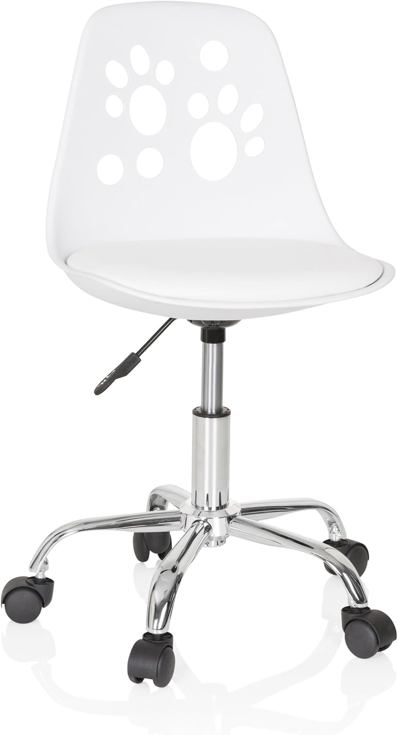 Der hjh OFFICE 742002 Kinderdrehstuhl Fancy I in Weiß ist ein mitwachsender Drehstuhl, der durch sein peppiges Design und das süße Tiermotiv mit Katzenpfoten in der Rückenlehne besticht. Er eignet sich für Kinder ab einer Körpergröße von ca. 110 cm. Die ergonomisch geformte Rückenlehne und die Sitzschale bestehen aus robustem Kunststoff, während die bequem gepolsterte Sitzfläche mit Kunstleder-Bezug höchsten Komfort bietet. Die stufenlose Sitzhöhenverstellung ermöglicht eine individuelle Anpassung. **Highlights** - Mitwachsender Drehstuhl im peppigen Design - Süßes Tiermotiv in der Rückenlehne mit Katzenpfoten - Ergonomisch geformte Rückenlehne und Sitzschale aus robustem Kunststoff - Bequem gepolsterte Sitzfläche mit leicht zu reinigendem Kunstleder-Bezug - Stufenlose Sitzhöhenverstellung mit Toplift **Produkteigenschaften** - Ab einer Körpergröße von ca. 110 cm geeignet - Robustes Fußkreuz aus verchromtem Stahl für stabilen Stand - Abmessungen: 82 x 40 x 44 cm (H x B x T) - Belastbar bis 60 kg