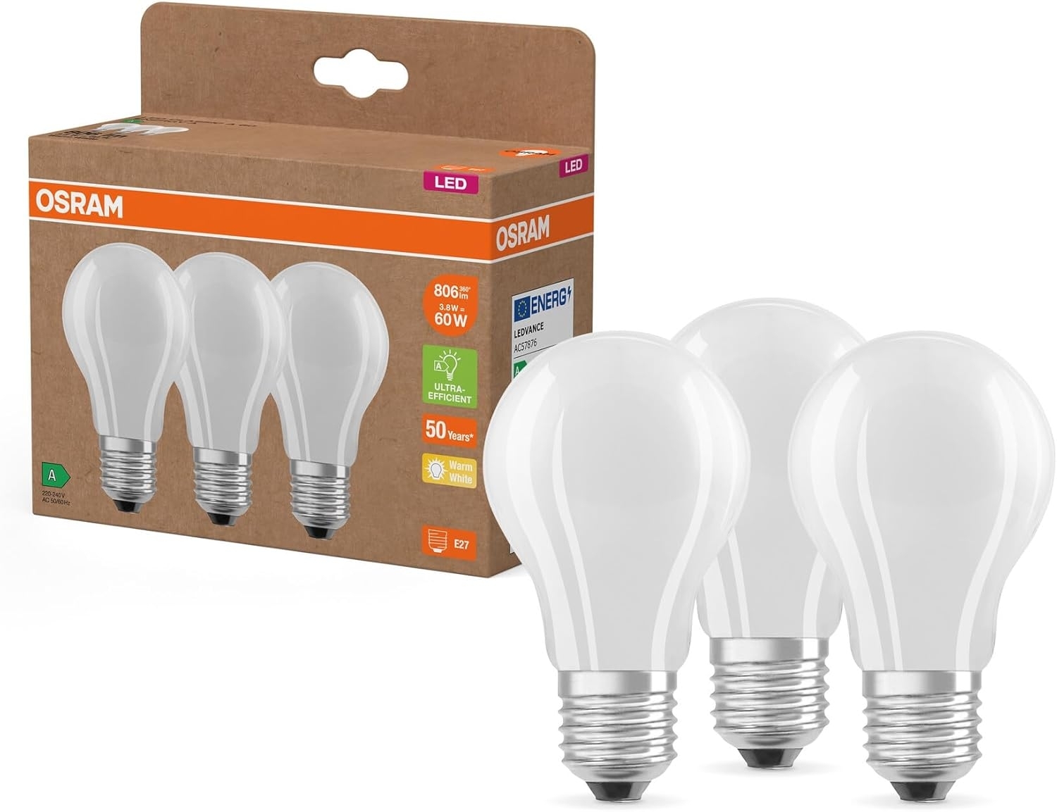 | Name | Osram Hocheffiziente LED Lampen mit Energieeffizienz Klasse A, Vorteilspack mit 3 Leuchtmittel, ersetzt herkömmliche 60W Glühbirnen, Birnenform, warmweiß(2700K), E27, mattes Glas |
