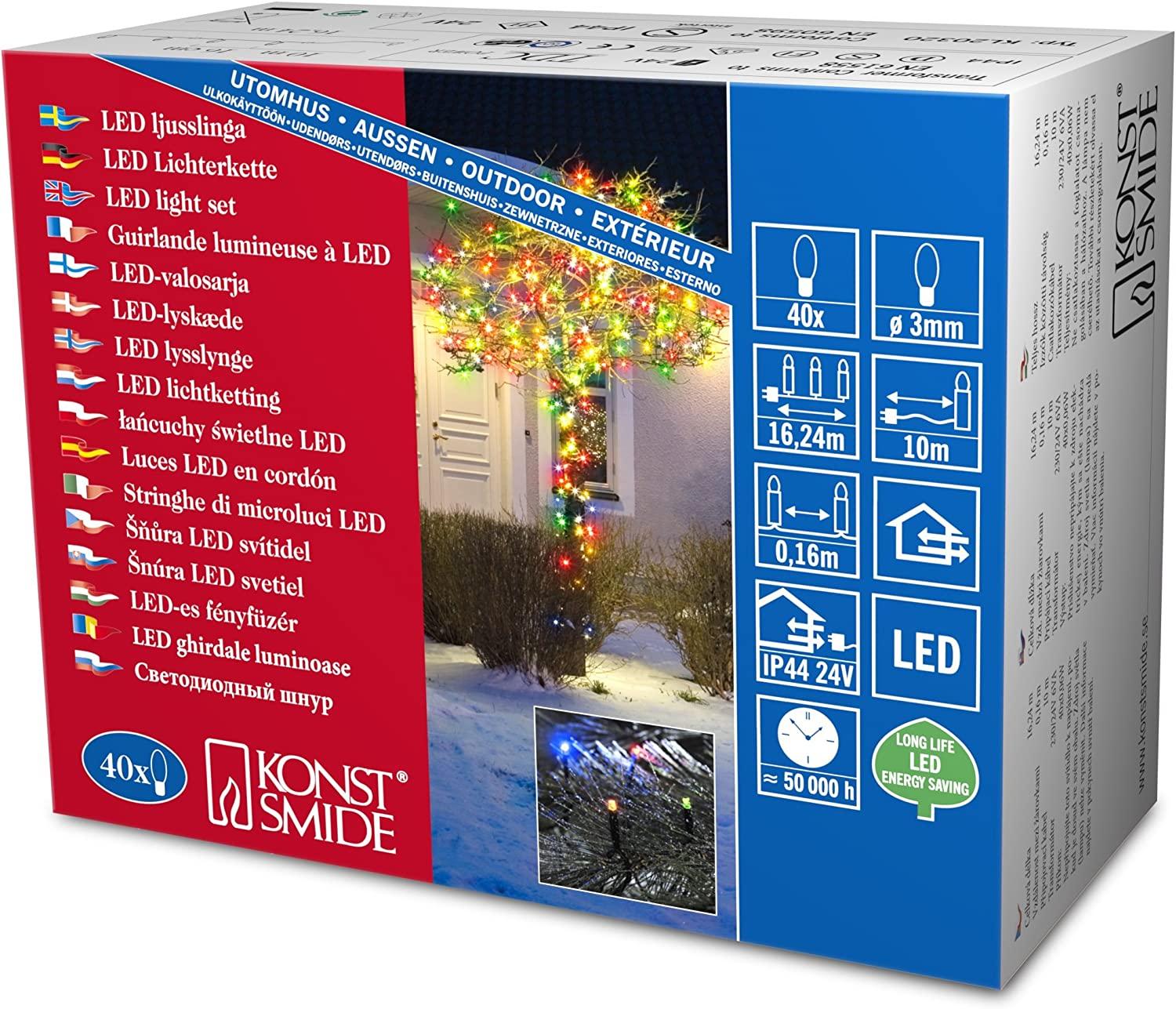 Die Micro LED Lichterkette mit 40 bunten Dioden sorgt für eine stimmungsvolle Beleuchtung im Außenbereich. Mit einer Leistung von 2,4 W und einer Lichtquelle von 0,06 W pro Diode bietet sie eine energieeffiziente Lösung. Die Lichterkette ist aus robustem Kunststoff gefertigt und hat eine IP44 Schutzklasse, die sie vor Spritzwasser schützt. **Highlights** - 40 bunte Dioden für eine farbenfrohe Beleuchtung - Für den Außenbereich geeignet, ideal für Garten und Terrasse - Energieeffizient mit Energieklasse A - Dimmbar für individuelle Lichtstimmungen - IP44 Schutzklasse für Spritzwasserschutz **Produkteigenschaften** - Farbe: Schwarz - Lichtfarbe: Mehrfarbig / Bunt - Material: Kunststoff - Steckerart: EUR - Energiequelle: Transformator - Transformator-Effekt: 3,6 W - Transformatorspannung: 24 V - Anzahl der Lichtquellen: 40 - Austauschbare Lichtquelle: Nein - Lichtquelle inklusive: Ja - Dimmbar: Ja - Energieverbrauch (k W / 1000 h): 4 - Kabelart: PVC - Kabelfarbe: Schwarz - IP-Schutzklasse (Produkt): IP44 - IP-Schutzklasse (Transformator): IP44