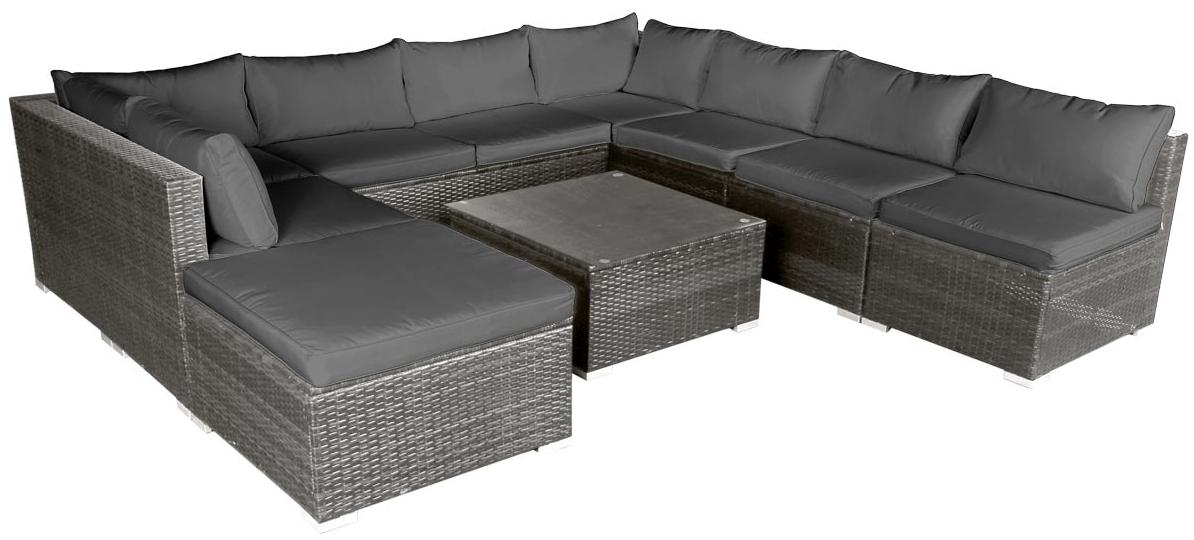 | Lieferumfang | 4x 2-Sitzer-Sofa-Modul, 1x Hocker, 1x Loungetisch, 9x Sitzkissen, 7x Rückenkissen, 2x Seitenkissen |