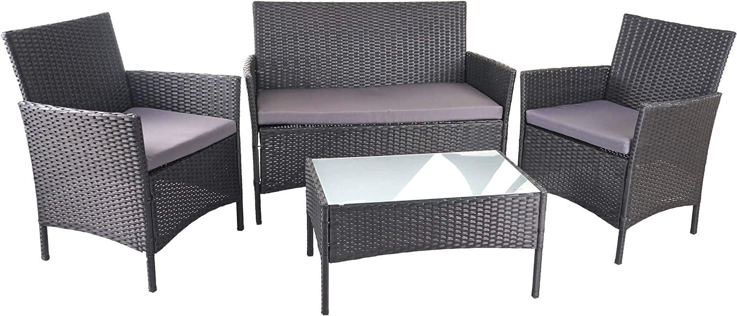 Die Poly-Rattan Garten-Garnitur HWC-D82 bietet Ihnen eine stilvolle und bequeme Sitzgelegenheit für entspannte Sommerabende im Freien. Mit zwei Sesseln, einer Bank und einem Tisch mit stabiler Glasplatte ist diese Sitzgruppe ideal für bis zu vier Personen. Die wasserabweisenden und waschbaren Kissenbezüge sorgen für zusätzlichen Komfort und Pflegeleichtigkeit. **Highlights** - 4 Sitzplätze für gesellige Runden - Polsterdicke von 6 cm für hohen Sitzkomfort - Wasserabweisende Bezüge für eine einfache Pflege - Waschbare Kissenbezüge mit Reißverschluss für hygienische Nutzung - Stabile Glasplatte, befestigt durch Saugnäpfe für Sicherheit **Produkteigenschaften** - Maße HxBxT (ca.): - Sessel: 84 x 58 x 52 cm - Bank: 84 x 106 x 52 cm - Tisch: 39 x 70 x 40 cm - Sitzfläche Sessel BxT: 48 x 46 cm - Sitzfläche Bank BxT: 97 x 45 cm - Ablagefläche Tisch BxT: 66 x 40 cm - Höhe Rückenlehne (vom Sitz aus gemessen): 45 cm - Höhe Armlehne (vom Sitz aus gemessen): 21 cm - Stärke der Glasplatte: 0,5 cm - Material: - Bezug: 100 % Polyester - Geflecht: Poly-Rattan - Gestell: Stahl - Tischplatte: Glas - Farbe: Geflecht: schwarz, Sitzkissen: anthrazit **Lieferumfang** - 2x Sessel - 1x Bank - Sitzkissen - 1x Tisch mit Glasplatte Hinweis: Die Garnitur sollte während des Winters wettergeschützt gelagert werden.