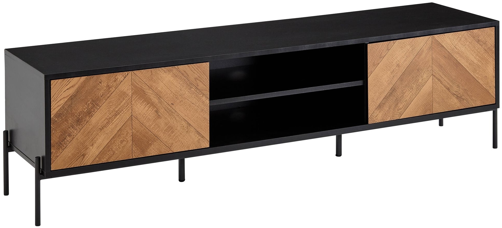 Das Lowboard in Schwarz und Eiche-Dekor bietet mit seinen Maßen von 163 x 45 x 40 cm viel Stauraum. Die TV-Kommode verfügt über zwei Türen mit einem ansprechenden V-Muster. Zwei offene Ablagefächer und zwei Türfächer bieten Platz für Spielekonsolen und DVDs. Die rechteckige Ablagefläche eignet sich ideal für Ihren Fernseher bis zu 70 Zoll. Mit Anti-Rutsch-Noppen und Kabeldurchlässen ausgestattet, überzeugt das moderne Design. Die Materialstärke beträgt 1,5 cm. **Highlights** - Geeignet für TV-Größen bis zu 70 Zoll: Ideal für große Fernseher - Zwei offene Ablagefächer und zwei Türfächer: Viel Stauraum für Spielekonsolen und DVDs - Anti-Rutsch-Noppen und Kabeldurchlässe: Schutz vor Kratzern und Kabelsalat - Empfohlene Maximalbelastbarkeit: 25 kg - Modernes Design mit V-Muster auf den Türfronten **Produkteigenschaften** - Abmessungen: Breite 163 cm, Höhe 45 cm, Tiefe 40 cm - Innenmaße je Türfach: 49 x 37 x 37 cm - Innenmaße je offenes Ablagefach: 56 x 13 x 37 cm - Bodenfreiheit: 14,5 cm - Material Korpus: Schwarz folierte Spanplatte - Material Türen: Dunkelbraune folierte Spanplatte in Eichenoptik - Material Beine: Pulverbeschichtetes Eisen **Lieferumfang** - Ein Lowboard ohne Dekoration - Montageanleitung und -material enthalten - Lieferzustand: demontiert und sicher verpackt