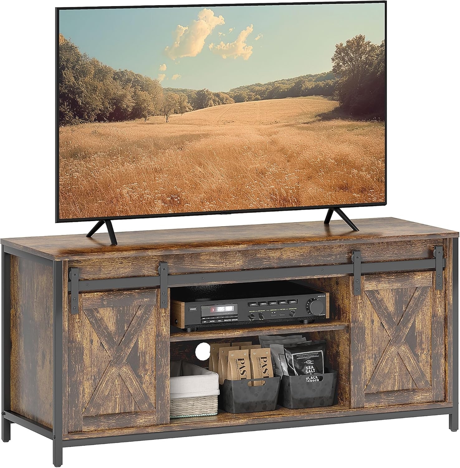| Name | HOMCOM TV-Lowboard Fernsehtisch TV Schrank mit Schrank Regal Fernsehschrank im Industrial Design zu 60 Zoll TV Schrank mit Schrank Regal TV-Kommode Spanholz Stahl Braun+Schwarz 120 x 40 x 54 cm |