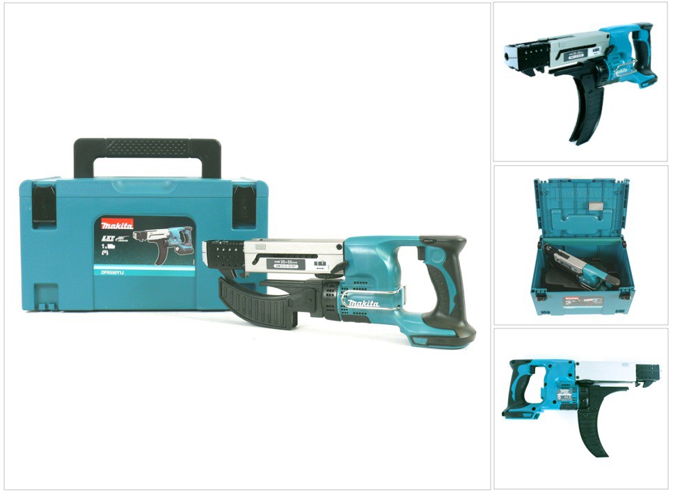 | Lieferumfang | Makita DFR 550 18 V Li-Ion Akku-Schnellbau-Magazinschrauber- 2x Schraubereinsatz für Makita DFR 550- MACPAK inkl. Einlage |