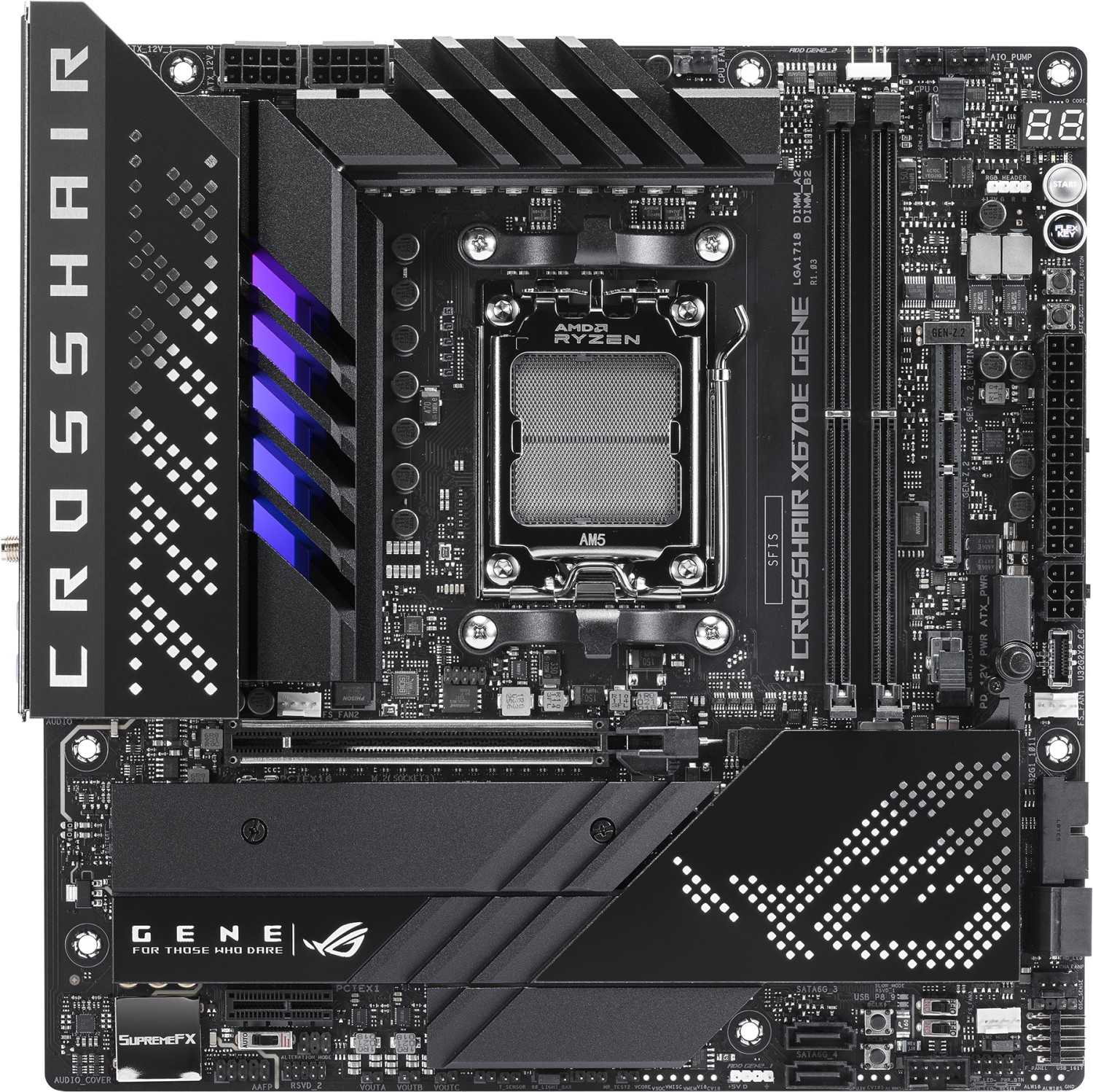 - Das ROG Crosshair X670E Gene unterstützt AMD Ryzen™ 7000er Prozessoren und bietet eine Kombination aus PCIe 5.0, DDR5, WiFi 6E und USB4 für leistungsstarke Desktop-Bauten.