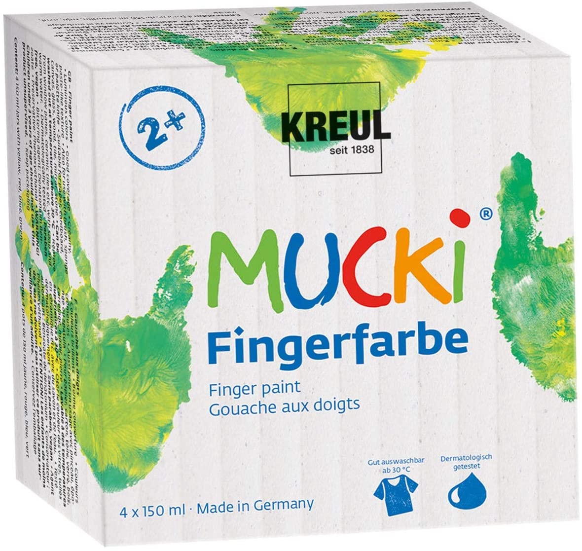 Malen, matschen, klecksen, rühren. Mit den Händen eintauchen und dann herumpatschen: das ist grenzenlose Entdeckerfreude! Wenn die kleinen Finger und Füße mit den leuchtenden MUCKI Fingerfarben in Kontakt kommen, passiert so viel: senso-motorische Fähigkeiten werden geschult, Fingerfertigkeiten verbessert und Freude und Neugier wächst. Was für ein Farberlebnis! Wer auf Entdeckungsreise geht braucht Sicherheit. MUCKI Fingerfarben wurden speziell für Kinder ab 2 Jahren entwickelt. MUCKI Fingerfarben sind dermatologisch getestet, frei von Parabenen, glutenfrei, laktosefrei und vegan. Bei dem Bewegungsdrang der kleinen Künstler kann schon mal etwas Farbe daneben gehen. Das ist aber kein Problem: MUCKI Fingerfarbe lässt sich leicht von den Händen und ab 30 °C aus der Kleidung waschen. 4 leuchtkräftige Farben je 50 ml gut auswaschbar ab 30 °C dermatologisch getestet auf Wasserbasis parabenfrei, glutenfrei, laktosefrei, vegan cremig-pastose Konsistenz für die optimale Anwendung mit Fingern und Händen auch mit Pinsel, Schwamm oder Spachtel vermalbar für Papier, Pappe, Keilrahmen, Glas, Holz, Fliesen, Spiegel, Stein bemalte Fensterscheiben, Fliesen o. ä. sind mit lauwarmem Seifenwasser leicht zu reinigen nicht geeignet für Kinder unter zwei Jahren entspricht den Anforderungen der aktuell gültigen Europäischen Spielzeugrichtlinie MUCKI Fingerfarben (Einzelfarben und Sets) wurden vom Arbeitsausschuß Kinderspiel + Spielzeug e. V. mit dem spiel gut Siegel ausgezeichnet Farben: gelb, rot, blau, grün