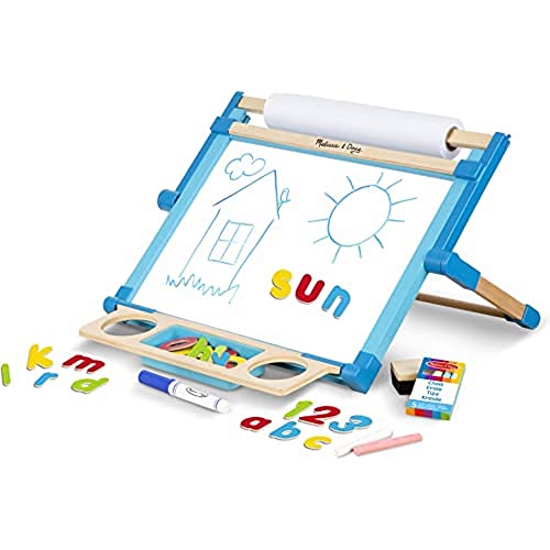 - Die Melissa & Doug Zweiseitige Tischstaffelei mit Zubehör ist eine stabile doppelseitige Tischstaffelei aus Holz, die sich zur Aufbewahrung flach zusammenlegen lässt