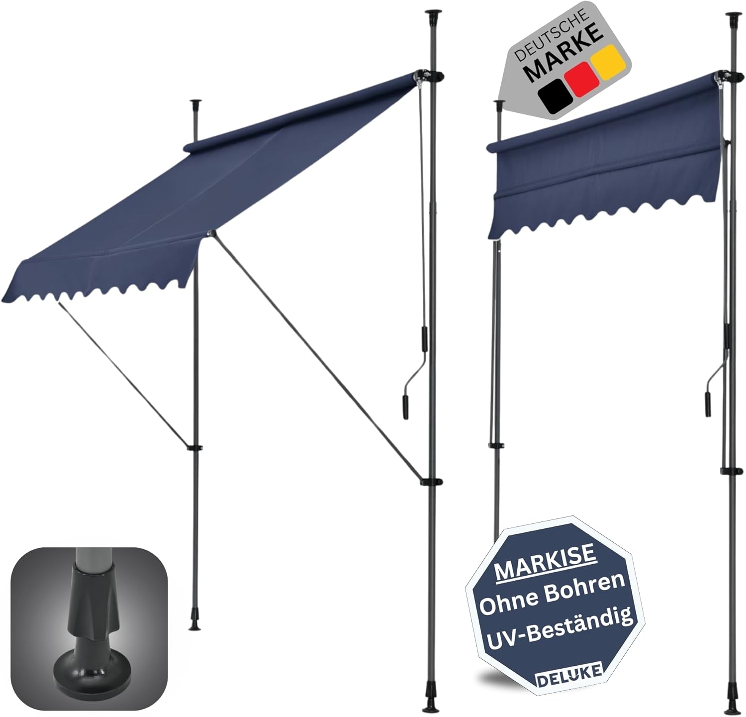 Die DELUKE® Klemmmarkise bietet Ihnen mit einer Breite von 400 cm und einer Höhe von 200 bis 300 cm optimalen Sonnenschutz für Balkon und Terrasse. Dank der praktischen Klemmtechnik ist eine Montage ohne Bohren möglich, was sie ideal für Mietwohnungen macht. Die Teleskopstangen sind höhenverstellbar und passen sich flexibel an verschiedene Einsatzorte an. Das wetterfeste und UV-beständige Polyestergewebe sorgt für angenehmen Schatten. **Highlights** Klemmmarkise ohne Bohren – Einfache Montage ohne Schrauben, ideal für Mietwohnungen Höhenverstellbar & flexibel – Teleskopstangen von 220 bis 309 cm ausziehbar Wetterfest & UV-beständig – Hochwertiges Polyestergewebe für zuverlässigen Sonnenschutz Variable Neigungseinstellung – Flexibler Neigungswinkel für optimalen Schutz vor Sonne Robust & leicht zu bedienen – Stabiler Stahlrahmen mit komfortablem Kurbelantrieb **Produkteigenschaften** Maße (BxHxT): 400 x 120 x 200-300 cm Material: Polyestergewebe, pulverbeschichteter Stahlrahmen Farbe: Blau