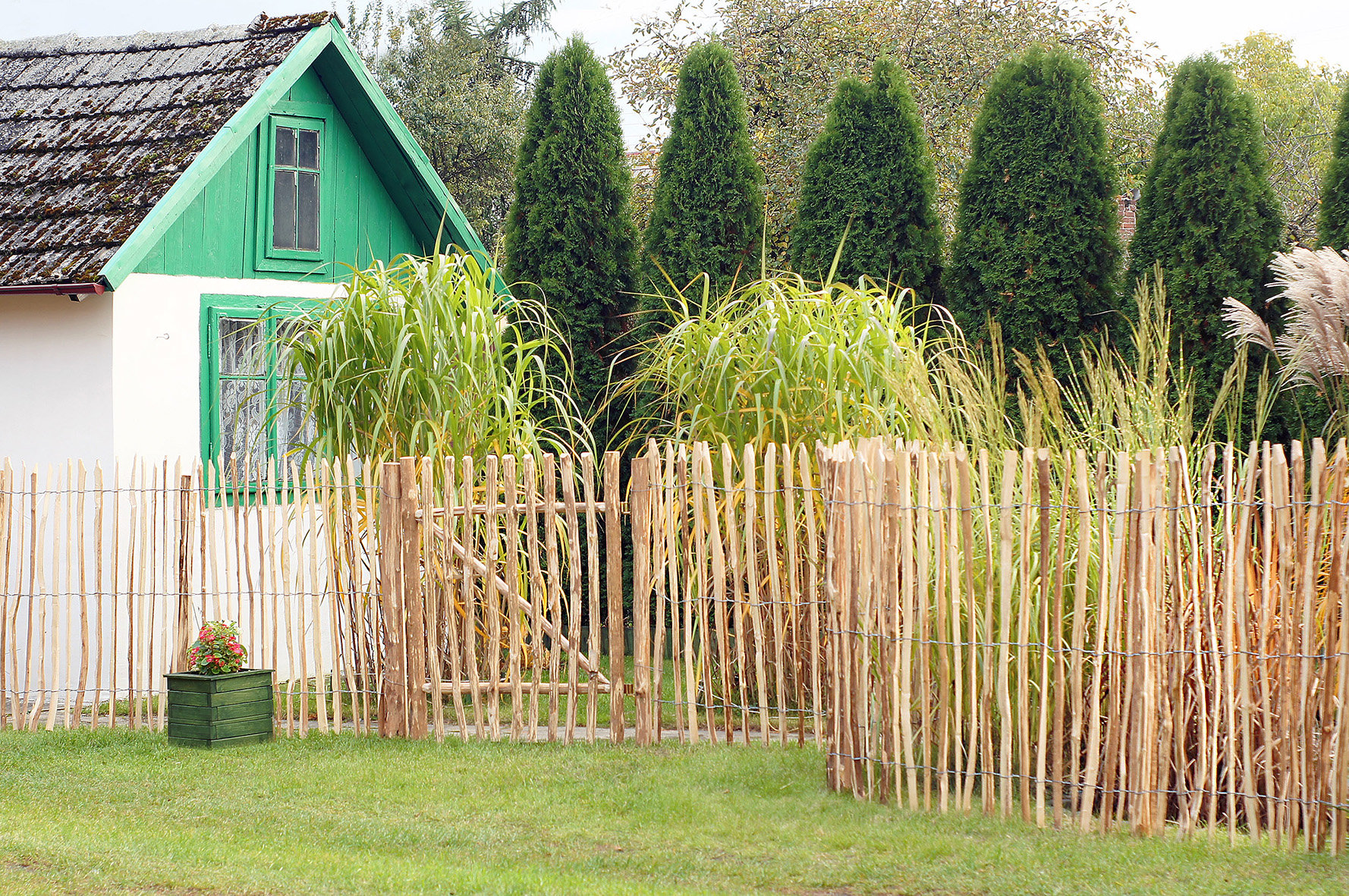 - Der Zaun besteht aus unbehandeltem Haselnuss-Holz