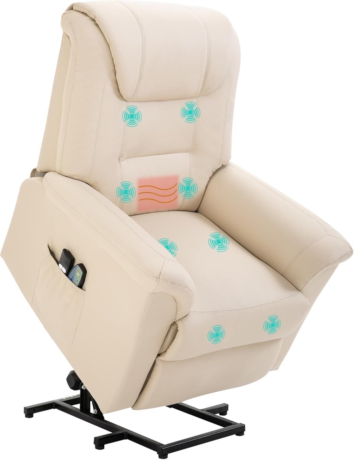Erleben Sie ultimativen Komfort mit dem HOMCOM Massagesessel, der über eine praktische Aufstehhilfe verfügt. Genießen Sie die wohltuende Massage durch acht Vibrationsmassagemotoren, die gezielt Rücken, Lendenwirbel, Oberschenkel und Waden ansprechen. Mit fünf vorprogrammierten Modi, zwei Intensitätsstufen und einer Heizfunktion im Lendenbereich bietet dieser Sessel ein rundum sorgloses Wohlfühlerlebnis. Ideal für ältere Menschen oder zur Unterstützung bei der Genesung. **Highlights** - Aufstehhilfe für müheloses Aufstehen - Rückenlehne bis zu 150 Grad verstellbar - 8 Vibrationsmassagepunkte für gezielte Entspannung - Heizfunktion im Lendenbereich für zusätzlichen Komfort - Einfache Bedienung mit Fernbedienung und Seitentaschen **Produkteigenschaften** - Farbe: Cremeweiß - Material: Kunstleder, Stahl, Schaumstoff, Kunststoff - Gesamtmaße: 93 x 95 x 106 cm - Liegemaße: 93 x 159 x 82 cm - Sitzgröße: 56 x 49 cm - Sitzhöhe: 48 cm - Liegewinkel: maximal 150° - Aufstehhilfe: maximal 45° - Eingangsspannung: AC 100–240 V, 50–60 Hz - Leistung: 52,2 W - Länge des Netzkabels: 1 m - Maximale Belastbarkeit: 150 kg **Lieferumfang** - 1 x Fernsehsessel - 1 x Anleitung - 1 x Fernbedienung