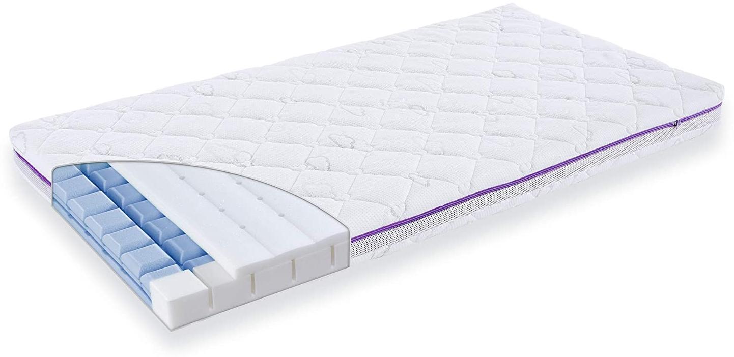 **Matratzenbezug** - Mit Vlies versteppt - Mit integriertem Nässeschutz - Mit extra Belüftungsband - Feuchtigkeitsregulierend - Antimon- und schadstoffgeprüft - Abnem- und waschbar **Matratzenkern** - Hochflexible 3D-comfort-pads aus Kaltschaum für exzellente Punktelastizität - Optimale Belüftung zwischen den Pads und durch vertikale Belüftungslöcher - Babyseite (Wellenkontur) und Kleinkindseite - Trittkanten an den Längsseiten mit Belüftungseinschnitten geben Sicherheit bei ersten Stehversuchen