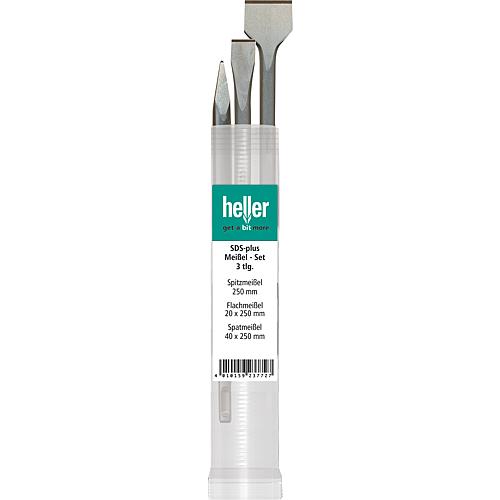 - Das Heller Meißel-Set besteht aus drei verschiedenen Meißeln: einem Spitzmeißel, einem Flachmeißel und einem Spatmeißel.
