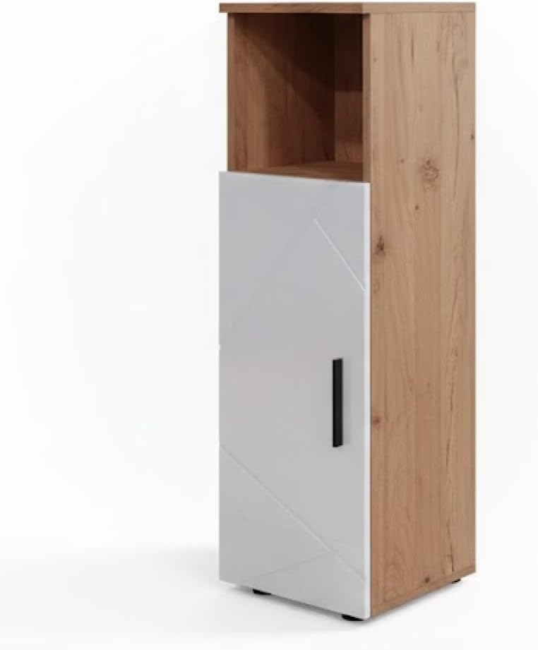 Der Vicco 'Irma' Midischrank vereint stilvolles Design mit funktionaler Badezimmerorganisation. Mit den Abmessungen 30 x 95 x 30 cm bietet er sowohl offene als auch geschlossene Ablageflächen für Ihre Badutensilien. Die Türöffnung kann umgekehrt werden, um sich optimal an Ihre Bedürfnisse anzupassen. Hergestellt aus pflegeleichter Spanplatte mit Melaminharzbeschichtung, ist dieser Schrank die ideale Ergänzung für jedes Badezimmer. **Highlights** - Offene und geschlossene Ablageflächen für optimale Organisation - Umkehrbare Türöffnung für individuelle Anpassung - Kompatibel mit anderen Produkten der Kollektion Irma - Pflegeleichte Oberfläche durch Melaminharzbeschichtung - Stilvolles Design in Eiche und Weiß Hochglanz **Produkteigenschaften** - Maße (BxHxT): 30 x 95 x 30 cm - Material: Spanplatte, 16 mm - Artikelgewicht: 12,71 kg - Artikelgewicht inkl. Verpackung: 13,7 kg **Lieferumfang** - Midischrank - Montageanleitung - Montagematerial